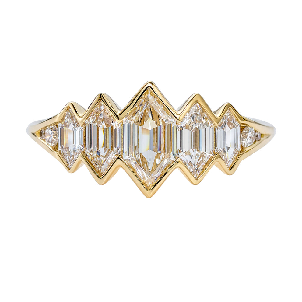 Mountain Lake Engagement Ring with Hexagon Cut Diamonds and a Golden Bezel