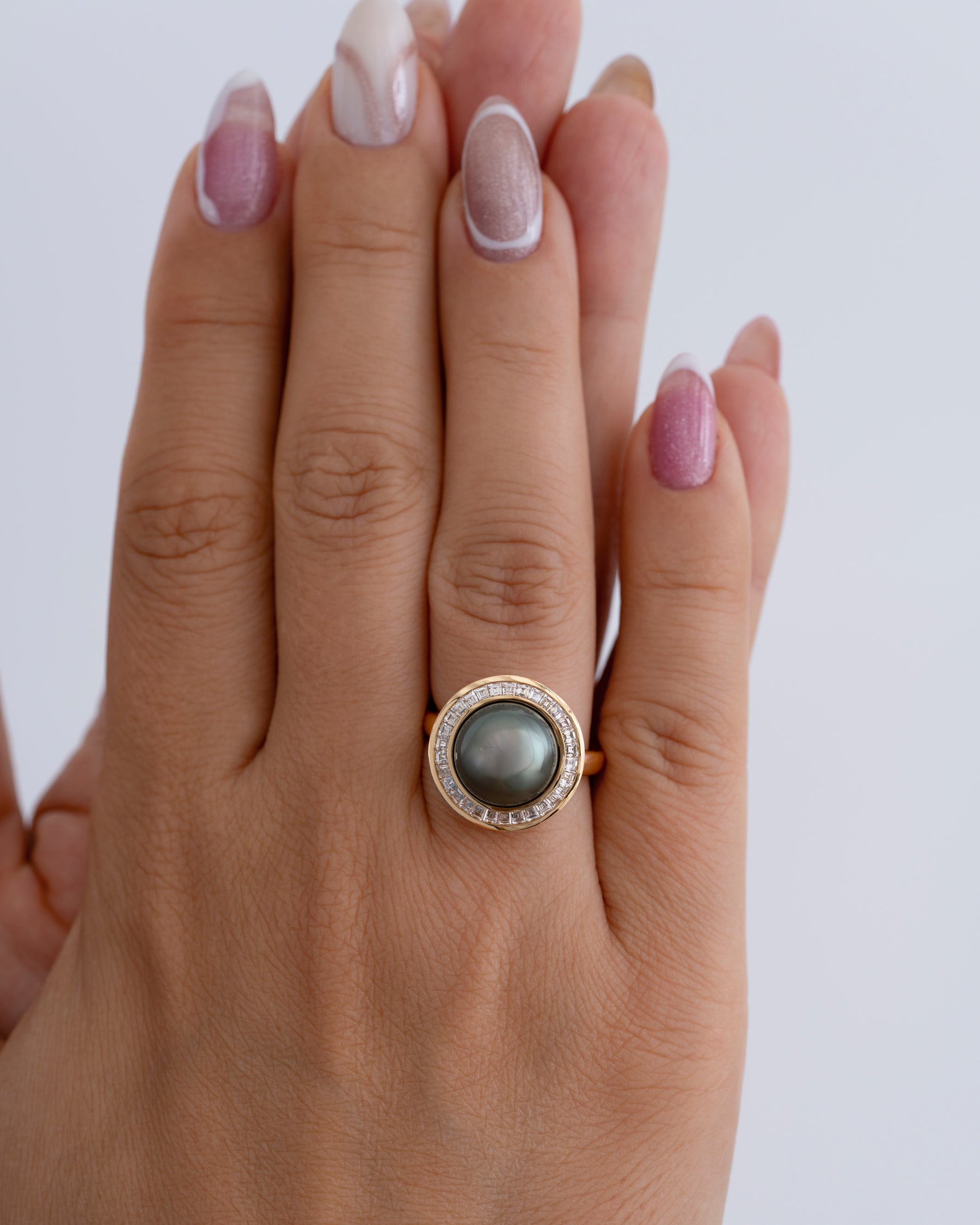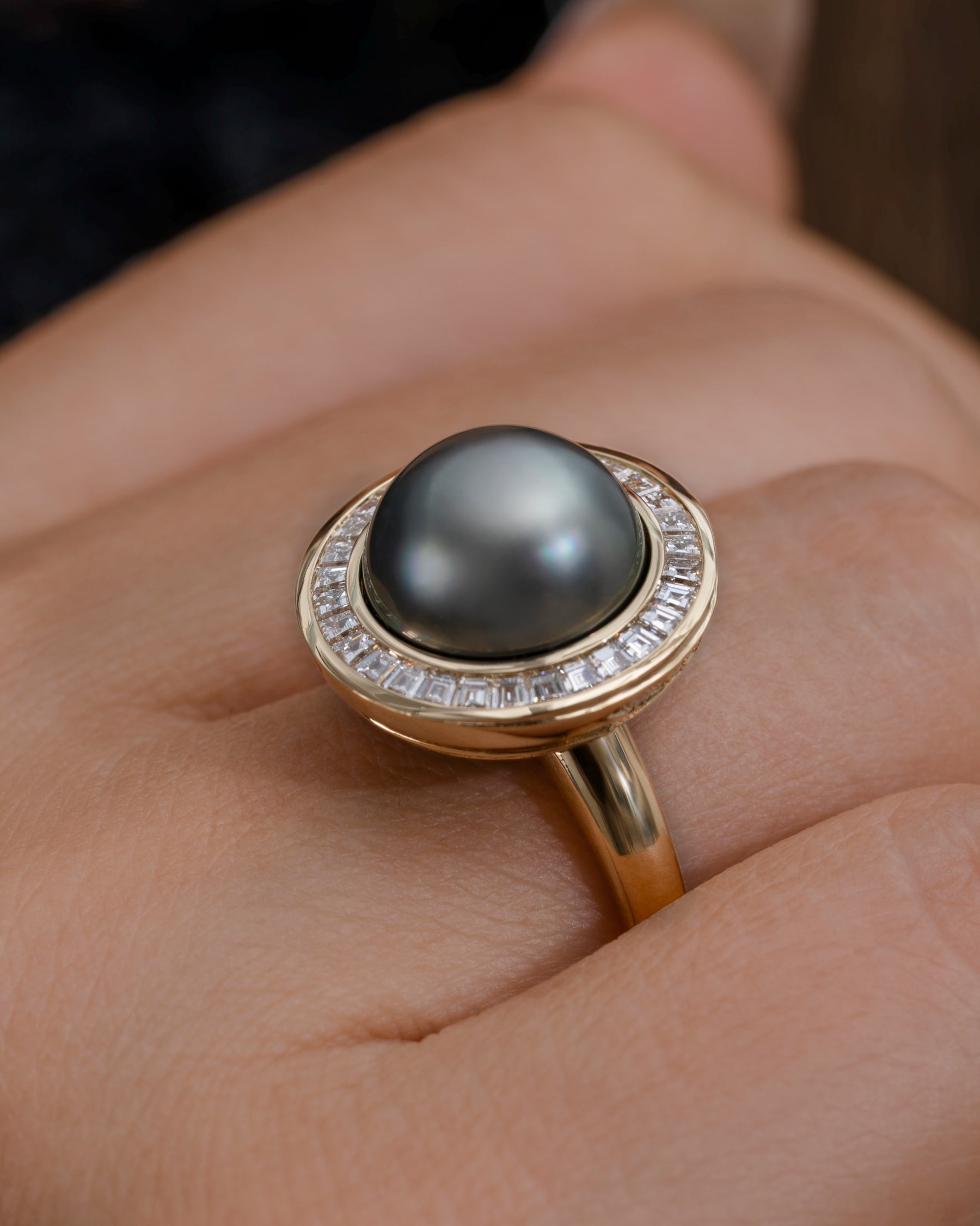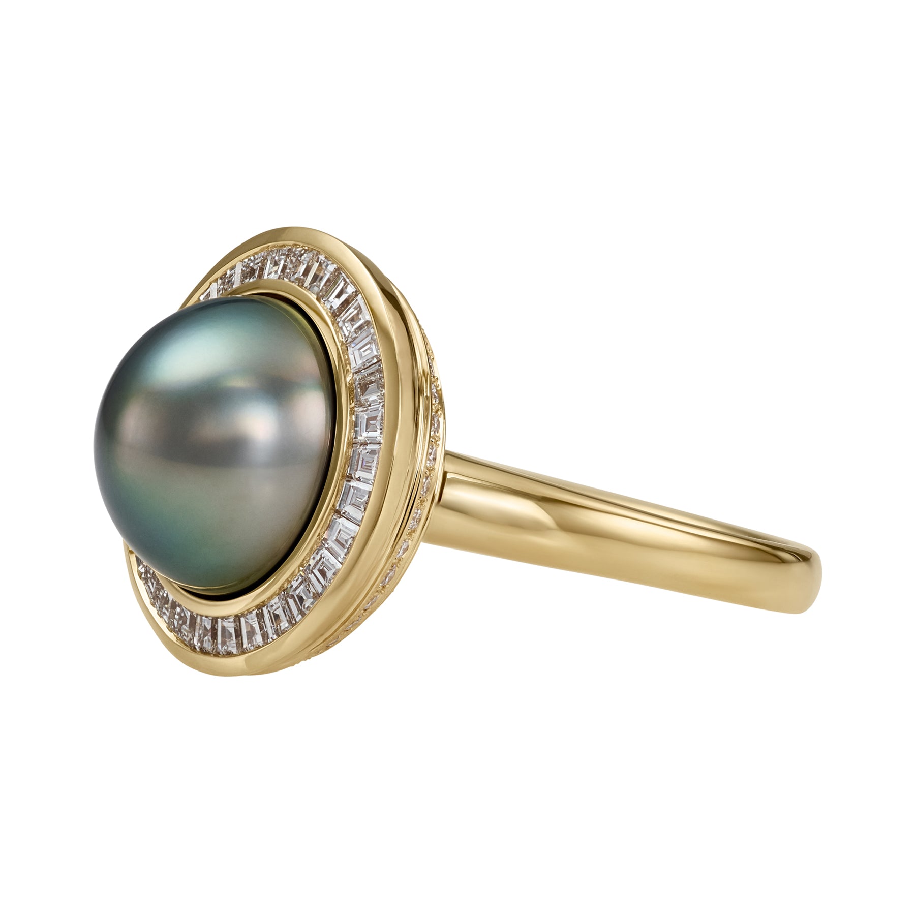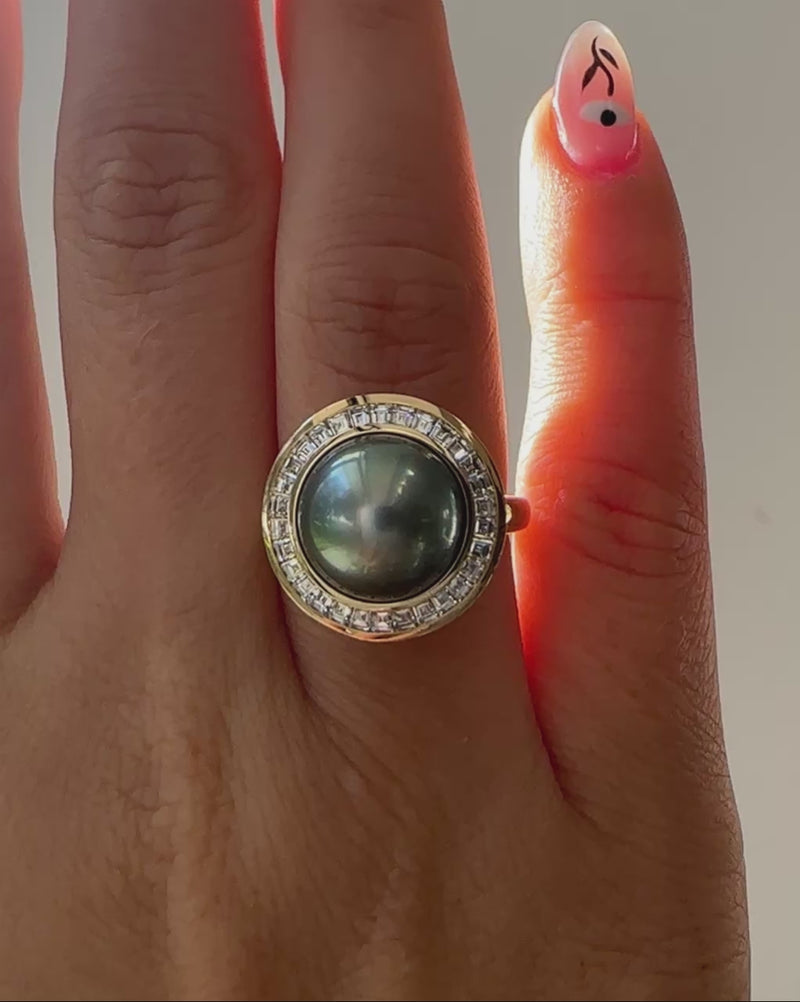 The Cassini Tahitian Pearl & Diamond Halo 18K Gold Ring is a show stopping piece. Crafted from 18K gold, this ring centers around a large, 11mm gray iridescent Tahitian pearl with green and blue overtones surrounded by a halo of custom-cut invisible set tapered baguette diamonds. A swirl of brilliant diamonds wrap around the bottom basket of the ring, adding an extra, yet subtle touch sparkle. It's a piece that balances dramatic scale with modern minimalism.