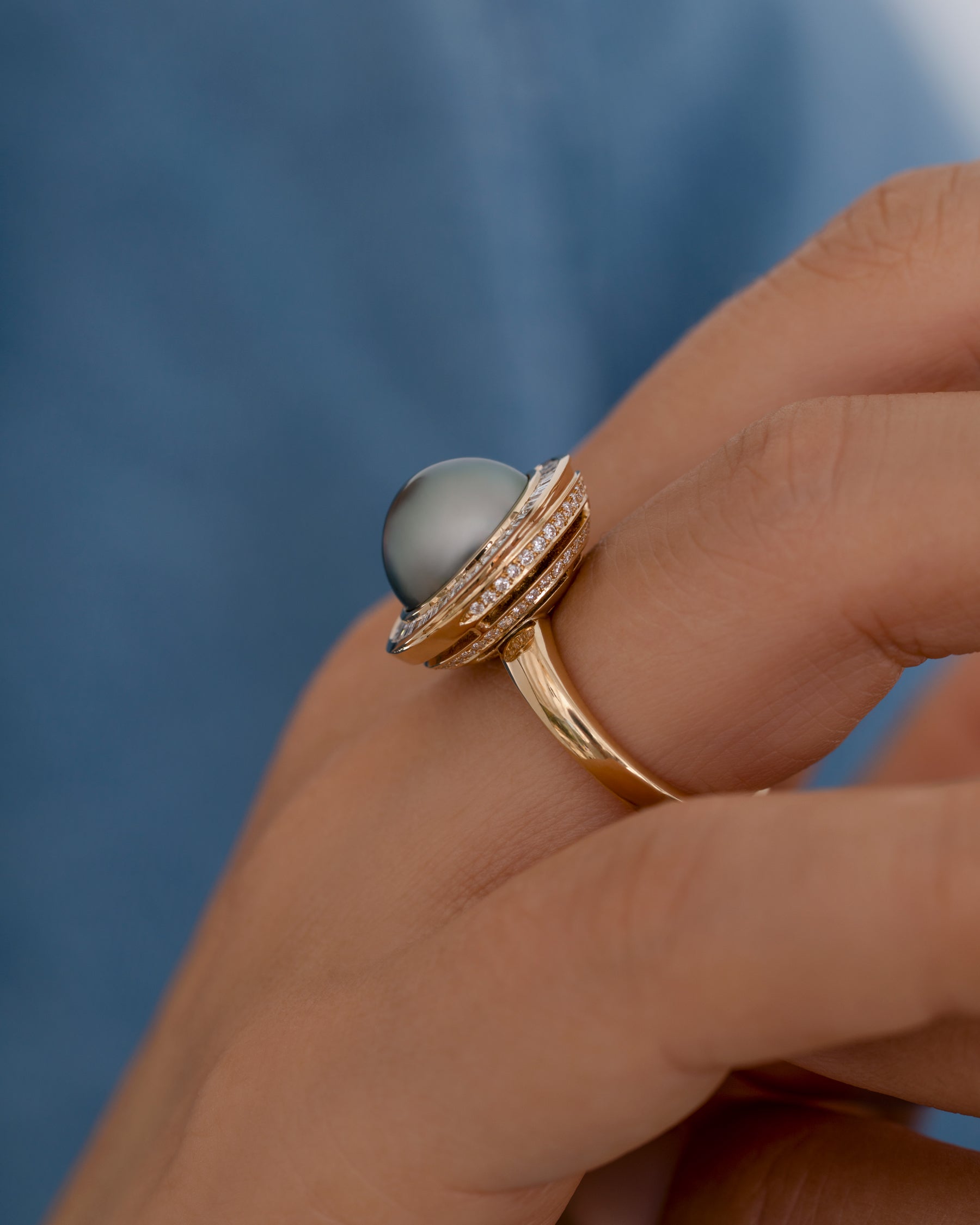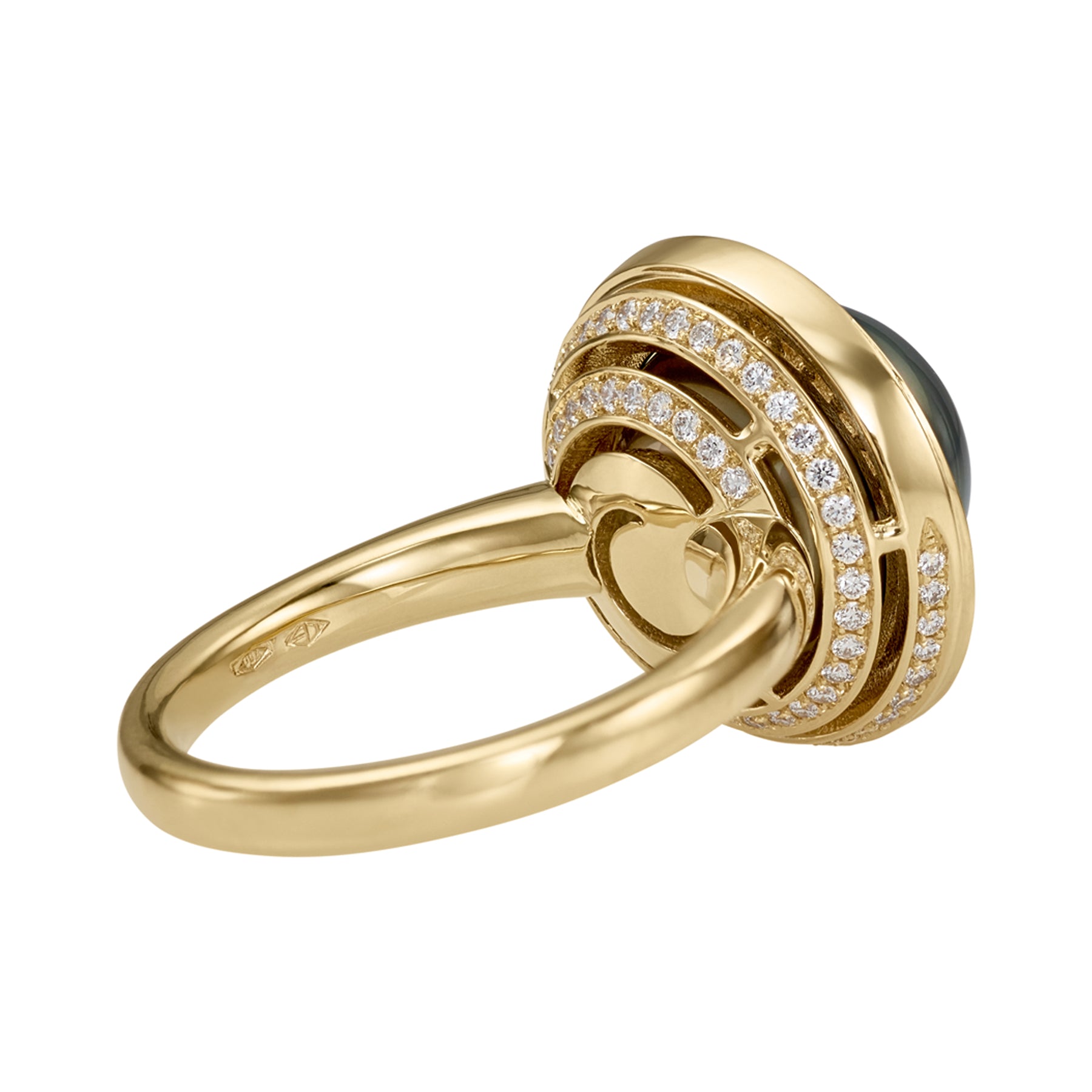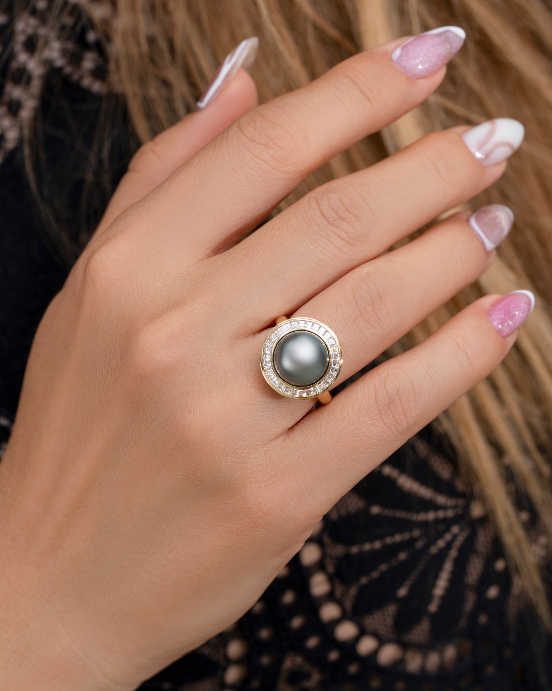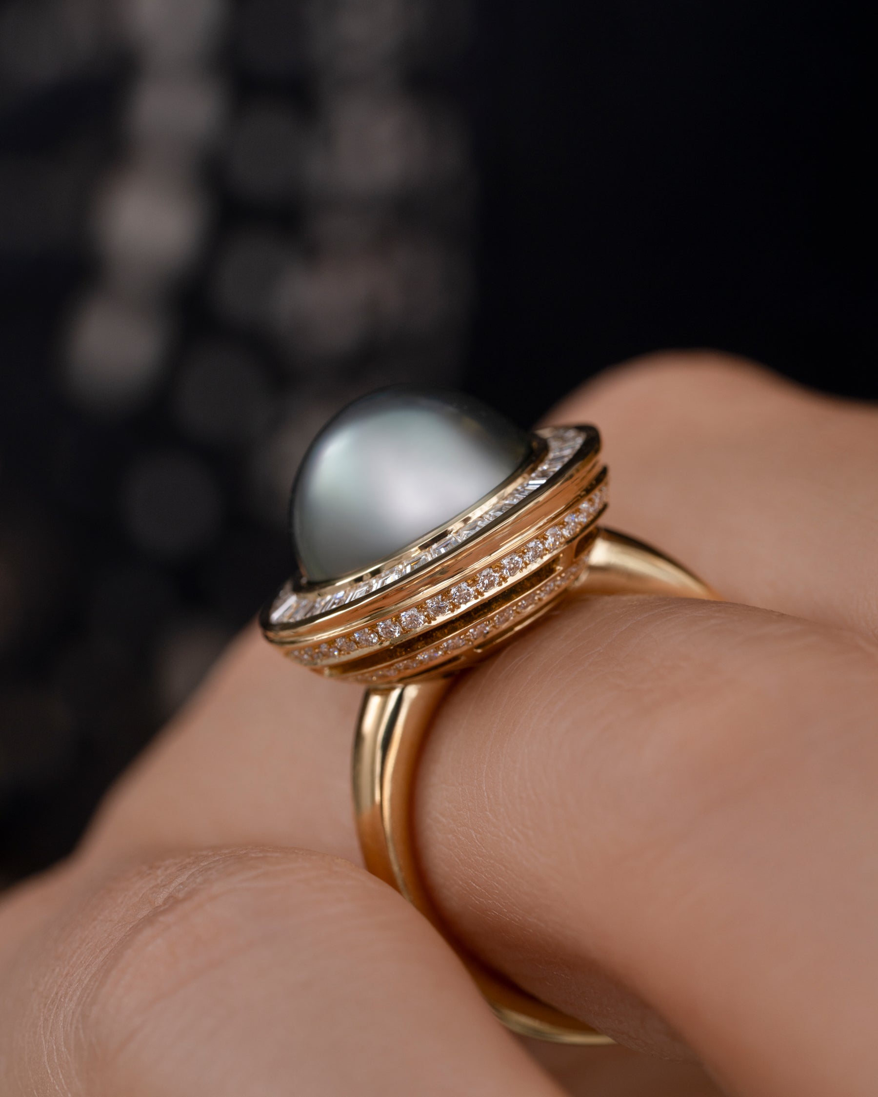 The Cassini Tahitian Pearl & Diamond Halo 18K Gold Ring is a show stopping piece. Crafted from 18K gold, this ring centers around a large, 11mm gray iridescent Tahitian pearl with green and blue overtones surrounded by a halo of custom-cut invisible set tapered baguette diamonds. A swirl of brilliant diamonds wrap around the bottom basket of the ring, adding an extra, yet subtle touch sparkle. It's a piece that balances dramatic scale with modern minimalism.