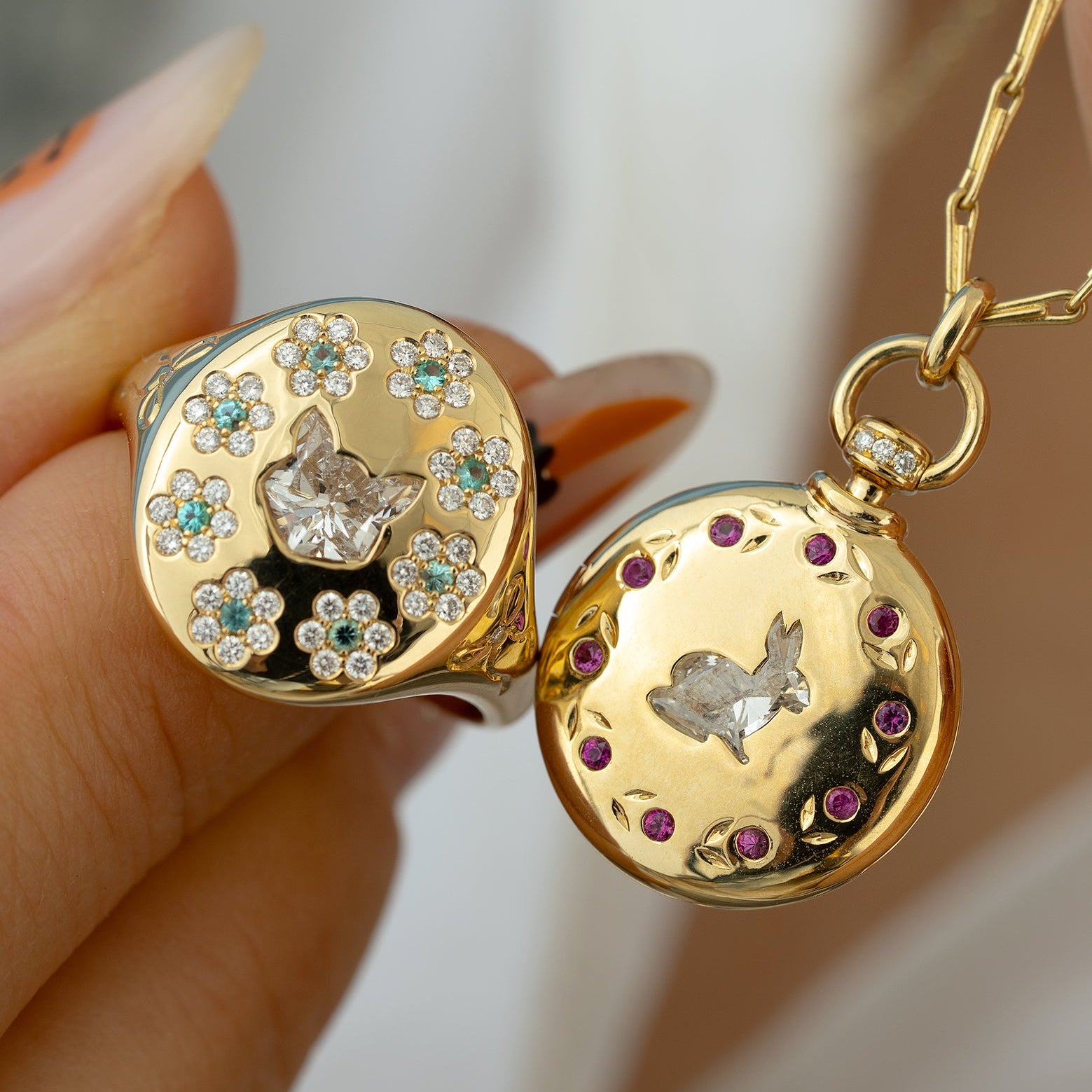 The Duchess Cat Shaped Diamond with Paraiba Flowers Signet Ring is a whimsical and refined design. Handcrafted in 18K gold, this enchanting ring showcases a cat-shaped diamond surrounded by a garden of diamond and paraiba tourmaline flowers. Engraved bows with diamond accents adorn each side, adding an extra touch of charm to this playful statement piece.