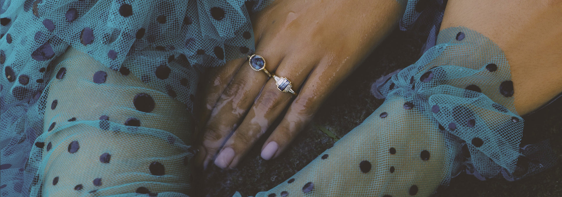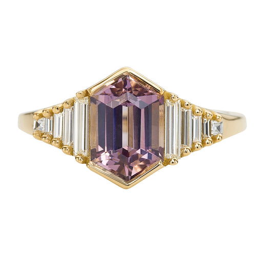 Lilac Engagement Ring with an Elongated Hexagon Spinel and Baguette Diamonds