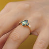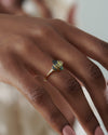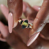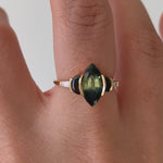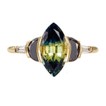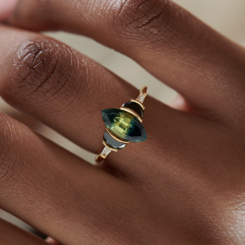 The Dragon's Eye parti sapphire & black diamond engagement ring is a one-of-a-kind piece. Hand crafted from 18K, a marquise parti sapphire in hues of dark teal and spring green is laid in an open bezel setting. A pair of black half moon diamonds and white tapered baguette diamonds frame the mesmerizing central stone. This OOAK design is an enchanting edition to any ring set.