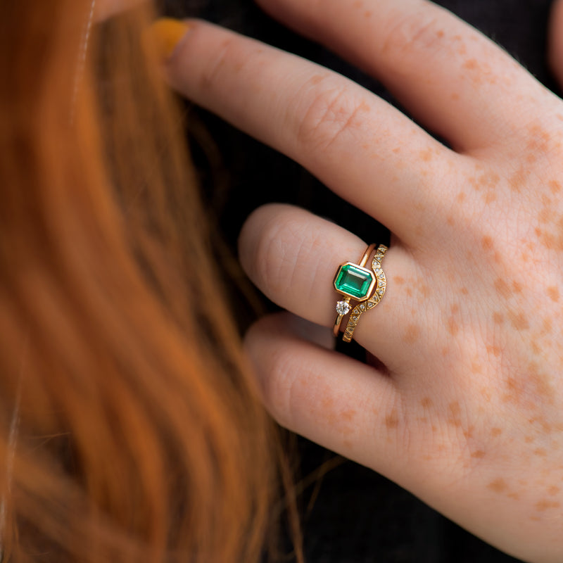 Asymmetric emerald engagement ring with a small diamond. The ring is set with a stunning high quality ~0.6 carat emerald.