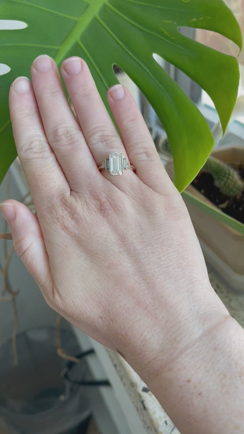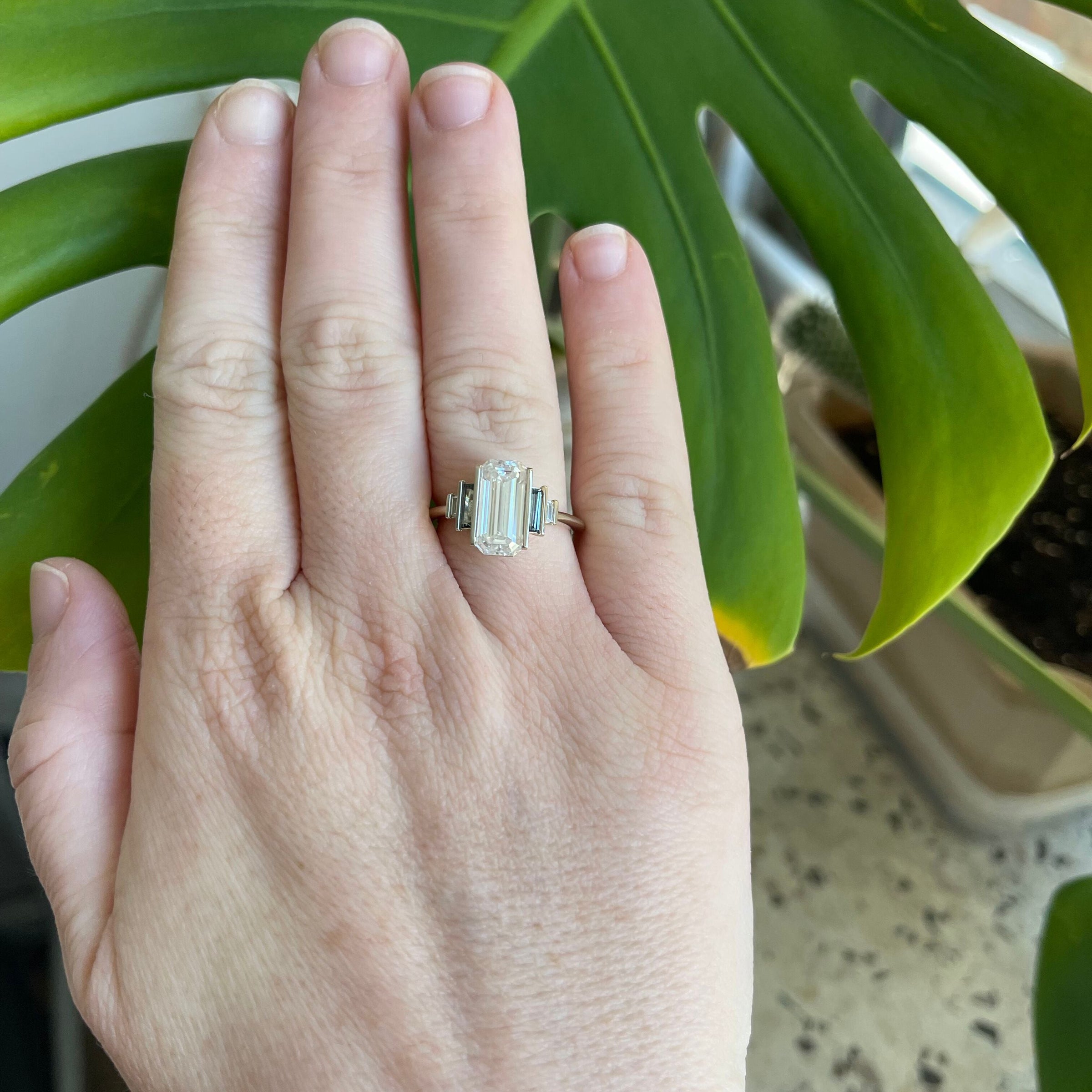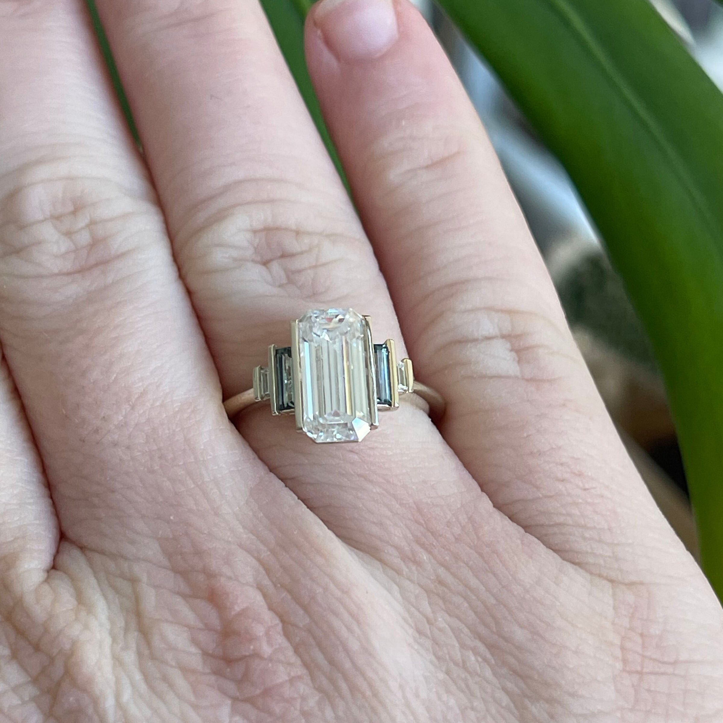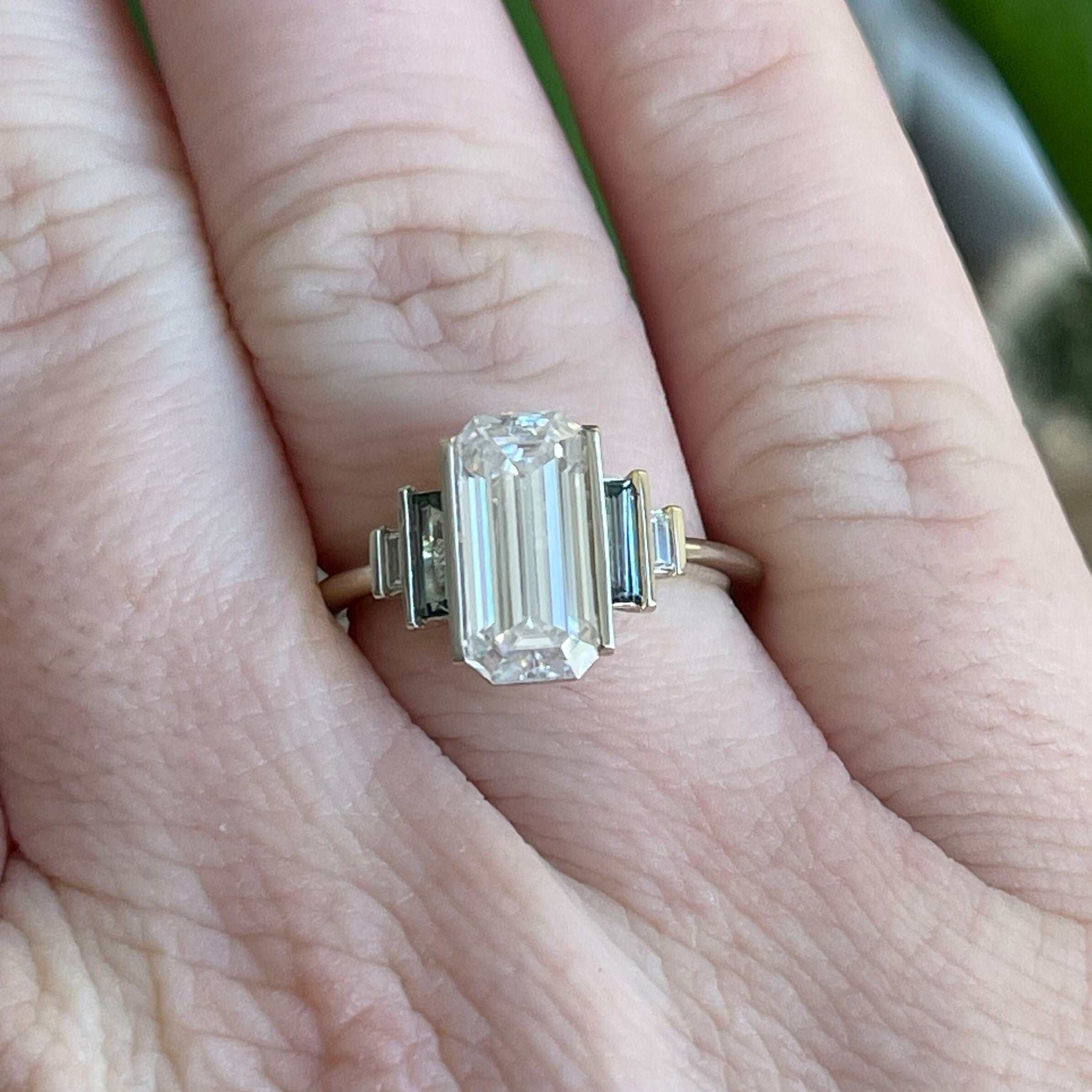 Custom Teal Sapphire and Moissanite  Geometric Emerald Cut Engagement Ring