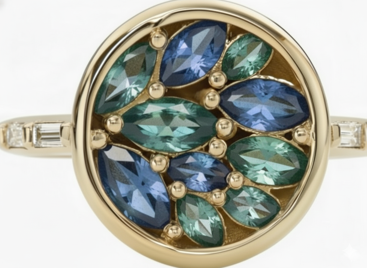 Custom Summertime Ring with Teal and Green Sapphire Petals