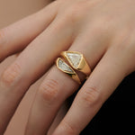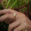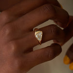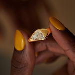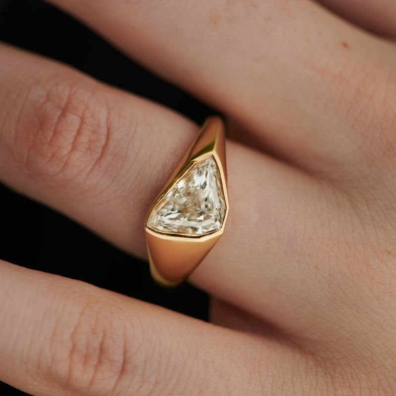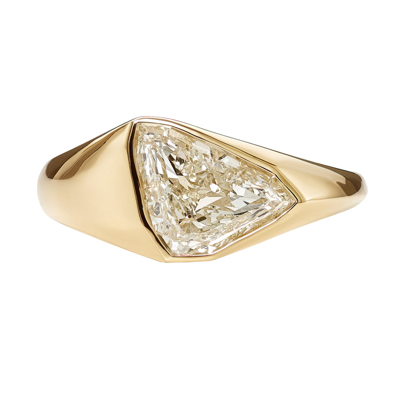The Floe Diamond Engagement Ring is handmade from 18K gold and set with a ~1.6ct modified triangle step cut diamond. The minimalist signet setting adds a touch of edge making this ring a modern classic.