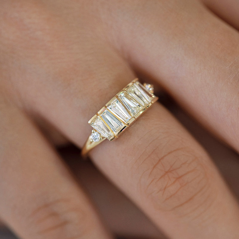 The tapered baguette diamond lineup ring features six radiant baguette cut diamonds and two brilliant round diamonds that come together to form a glistening diamond bar.