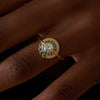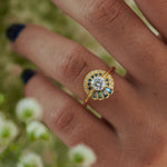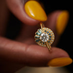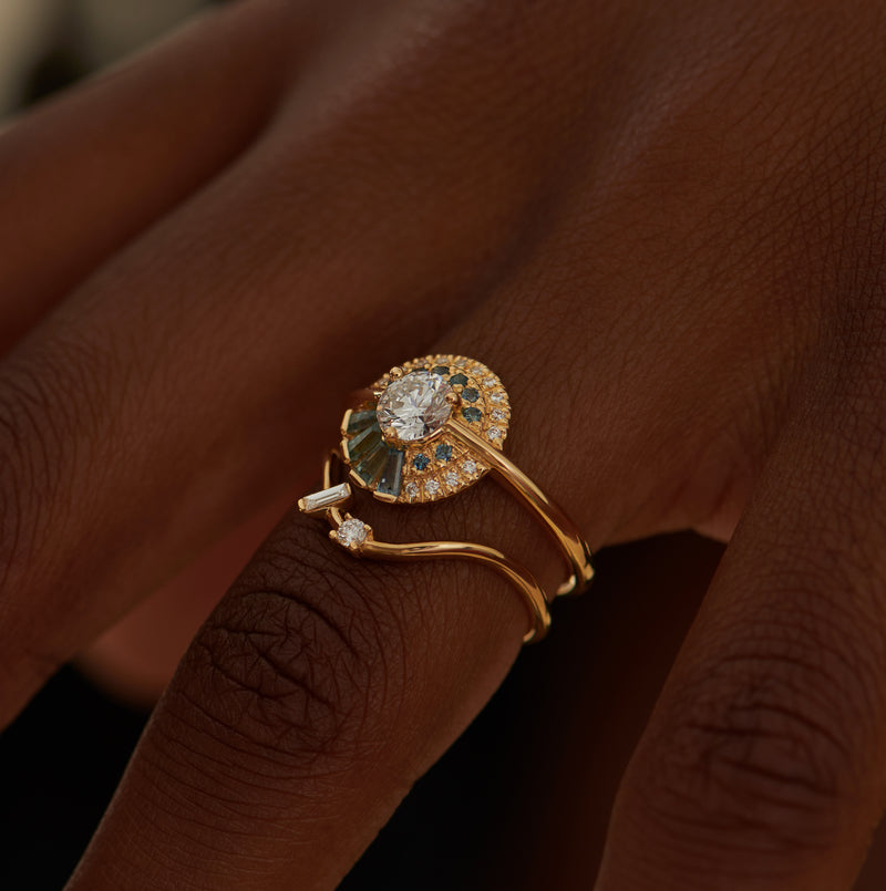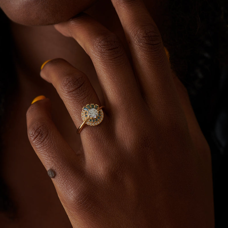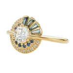 18k solid gold | ~0.5ct brilliant round diamond | 4 tapered baguette teal sapphires | Eight 1.2mm round teal sapphires | Fourteen 1mm round white diamonds