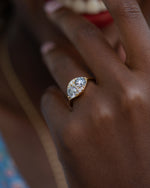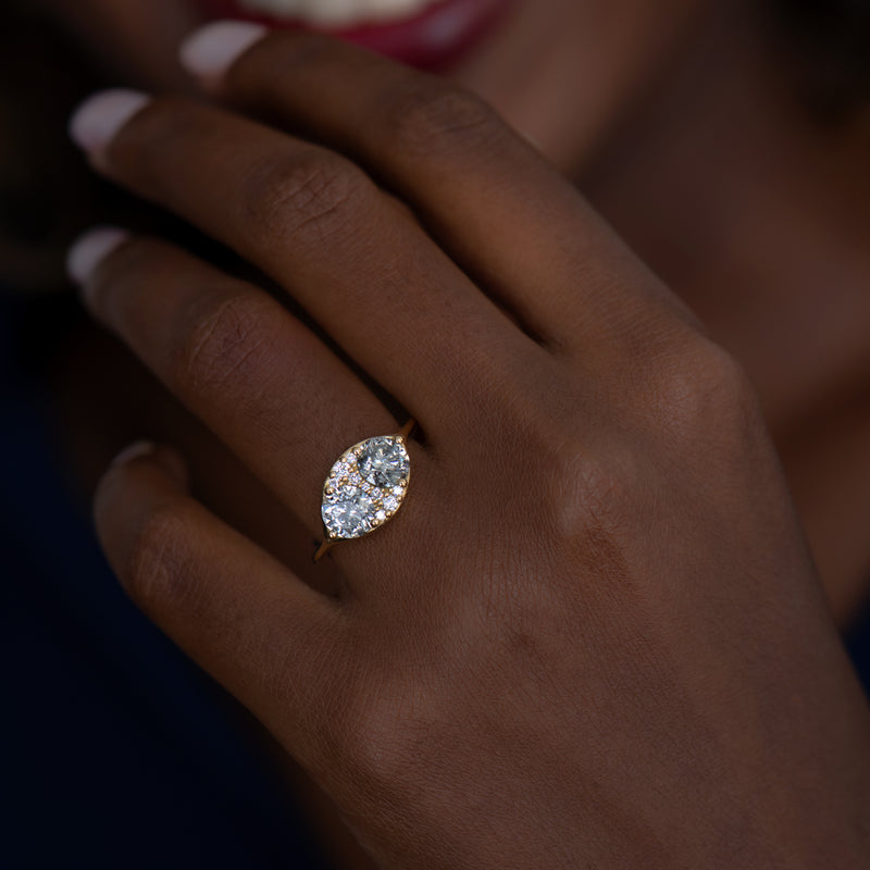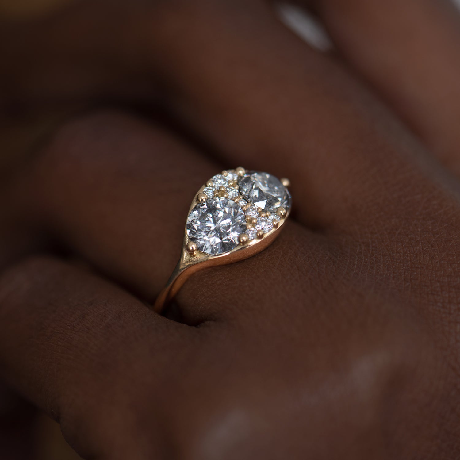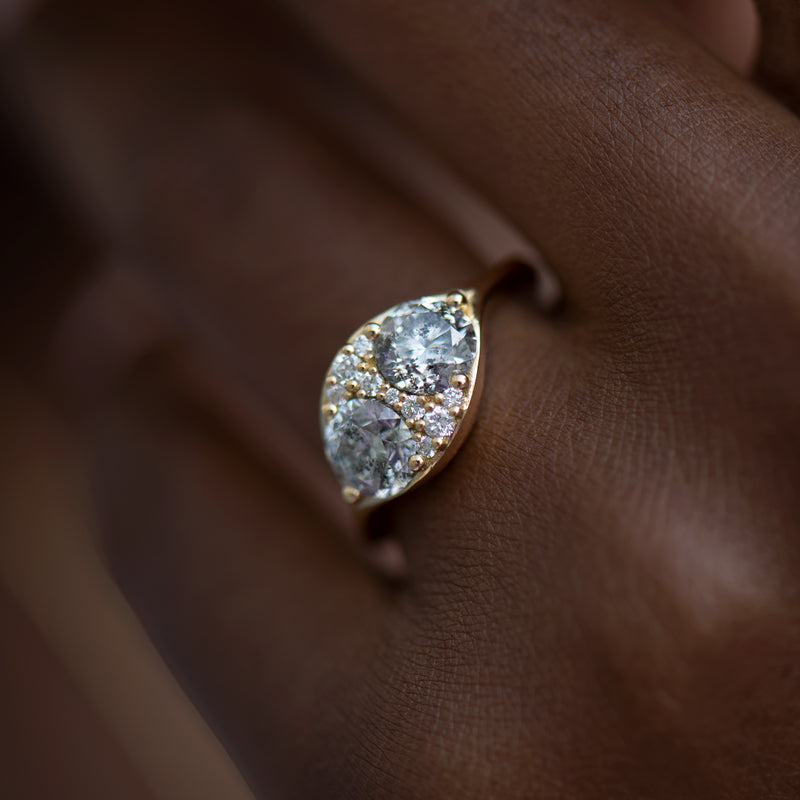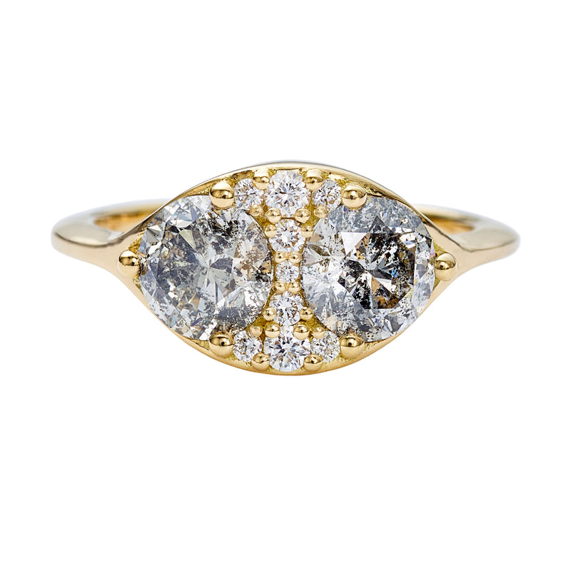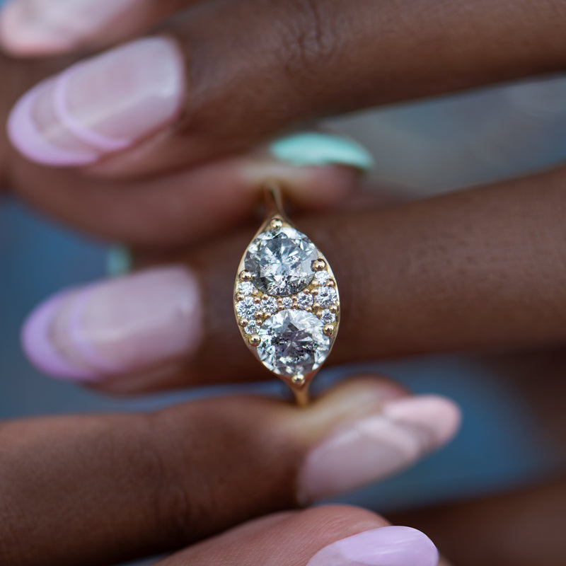 The Two salt and pepper engagement ring with a cluster of brilliant cut diamonds skillfully mixes together two different colored diamonds. Featuring two OOAK salt and pepper brilliant cut diamonds, this ring takes this classic cut and incorporates it into a new composition. Next to the central peppered stones, a cluster of small brilliant cut diamonds completes the design.