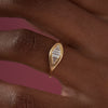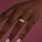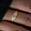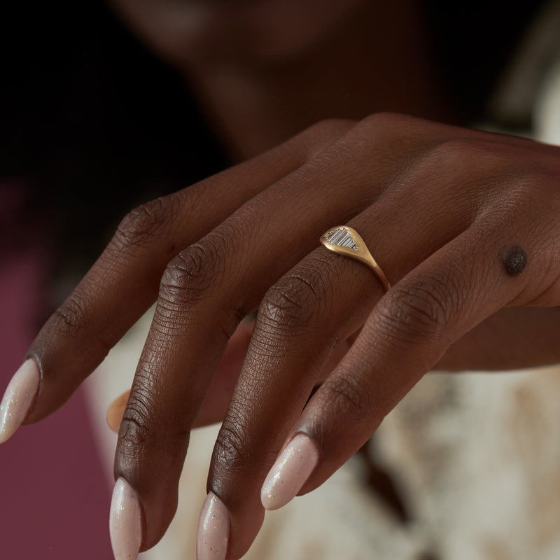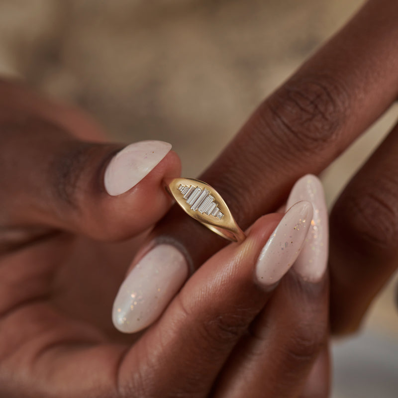 The Empire Baguette Diamond Matte Gold Ring is handcrafted from 18K gold. This ring features glimmering baguette cut diamonds arranged in an art deco style formation and set in our unique take on a channel setting. A matte gold finish completes this chic and streamlined piece.