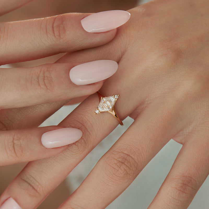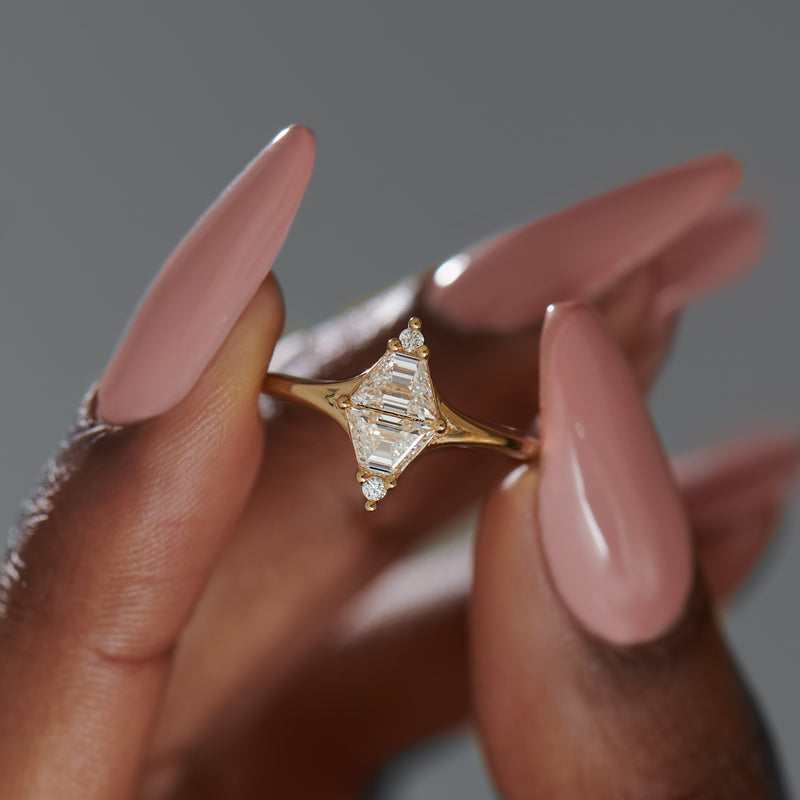 The Mirror Trapeze Diamond Engagement Ring is handcrafted in our studio from 18K gold. Two trapeze diamonds reflect each other as the center piece of the design with a brilliant diamond accent on both the top and bottom.