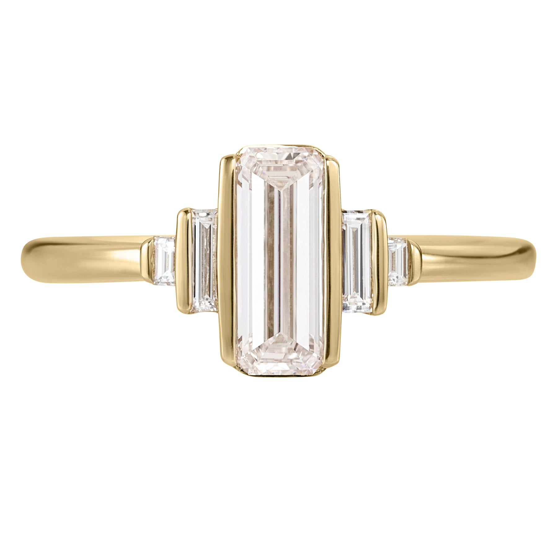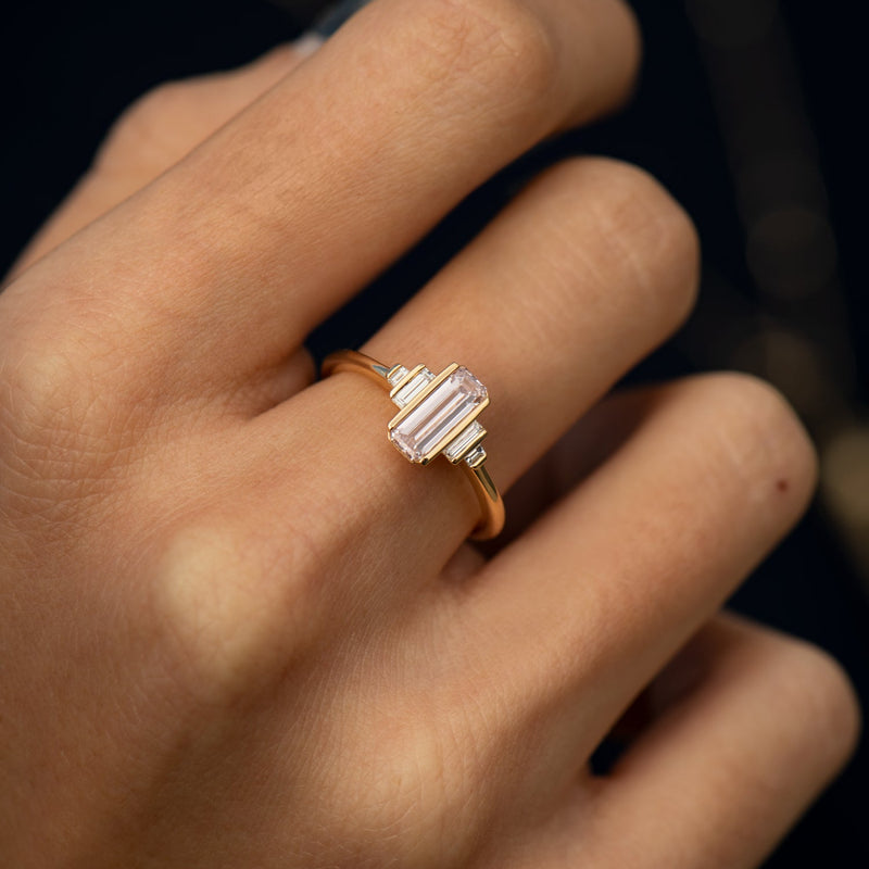 The Blossom pink diamond engagement ring is one-of-a-kind piece hand crafted from 18K gold. This ring features a unique, soft pink emerald cut diamond is framed by two sets of white diamond baguettes. The Blossom engagement ring adds a subtle touch of color to any look.