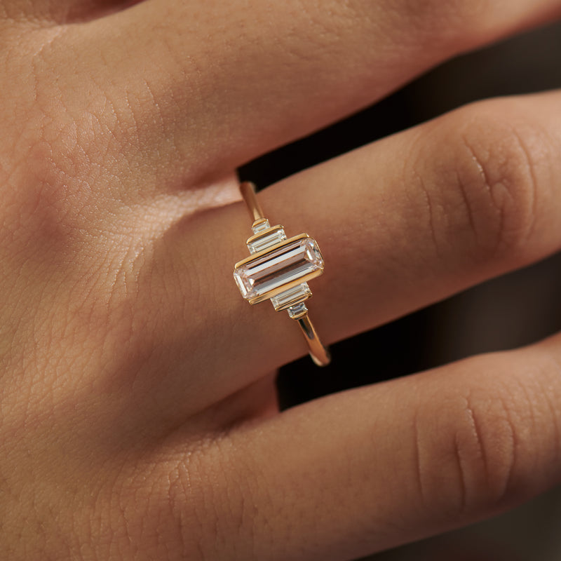 18k solid gold | Pink baguette cut diamond | White baguette cut diamond.