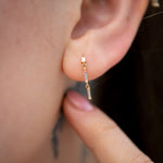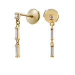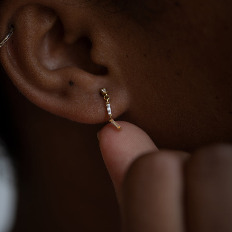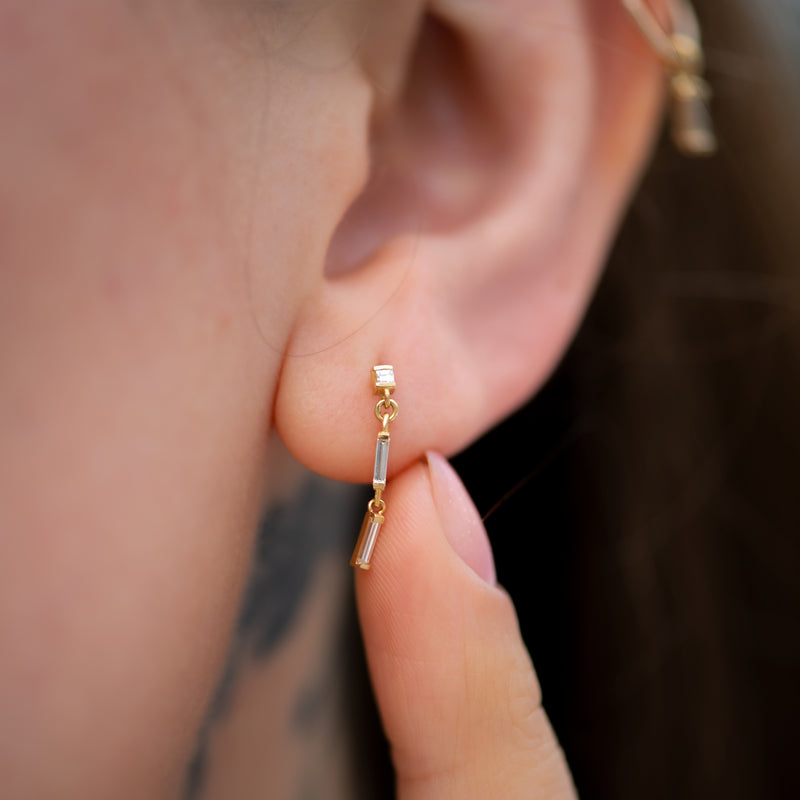 The dainty baguette diamond drop earrings feature a petite square baguette diamond that drop into two radiant needle baguette diamonds. These petite earrings are perfect for everyday and will add charm and subtle movement to your ear.