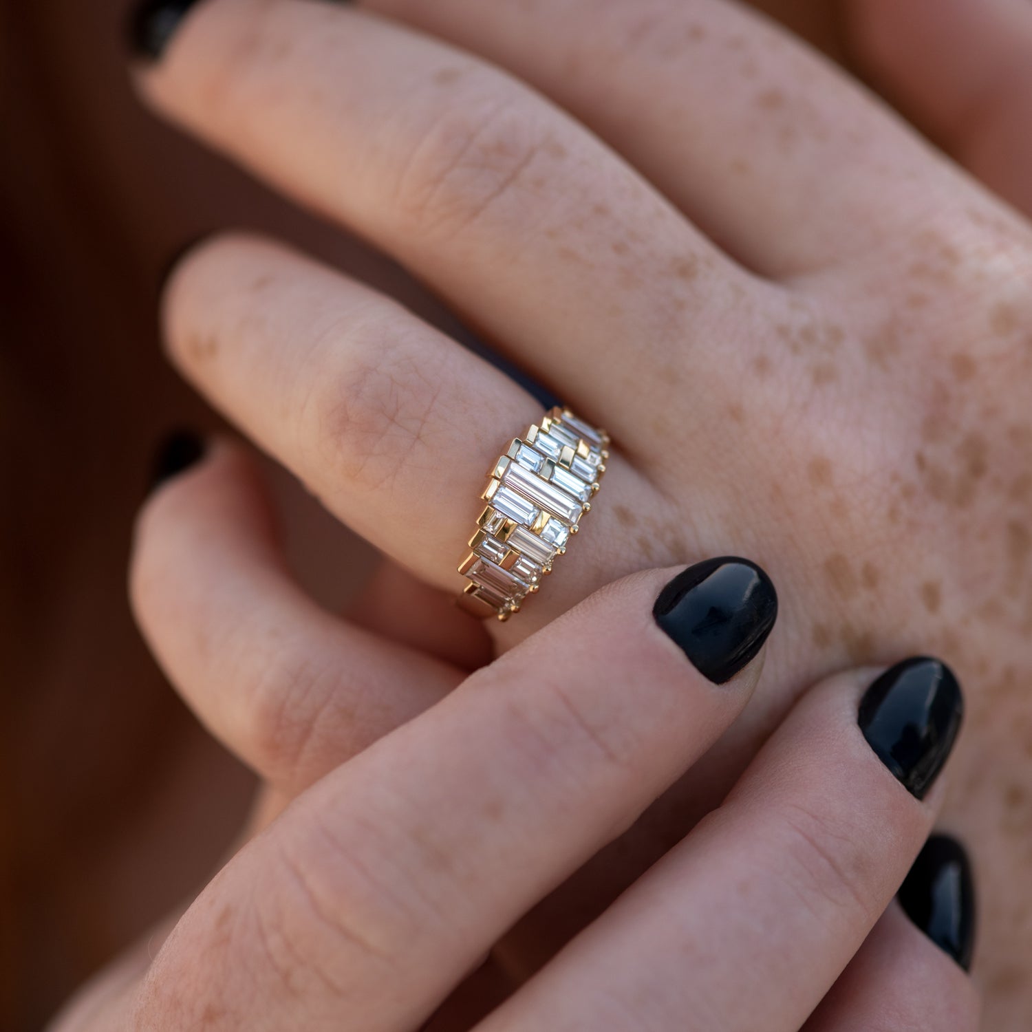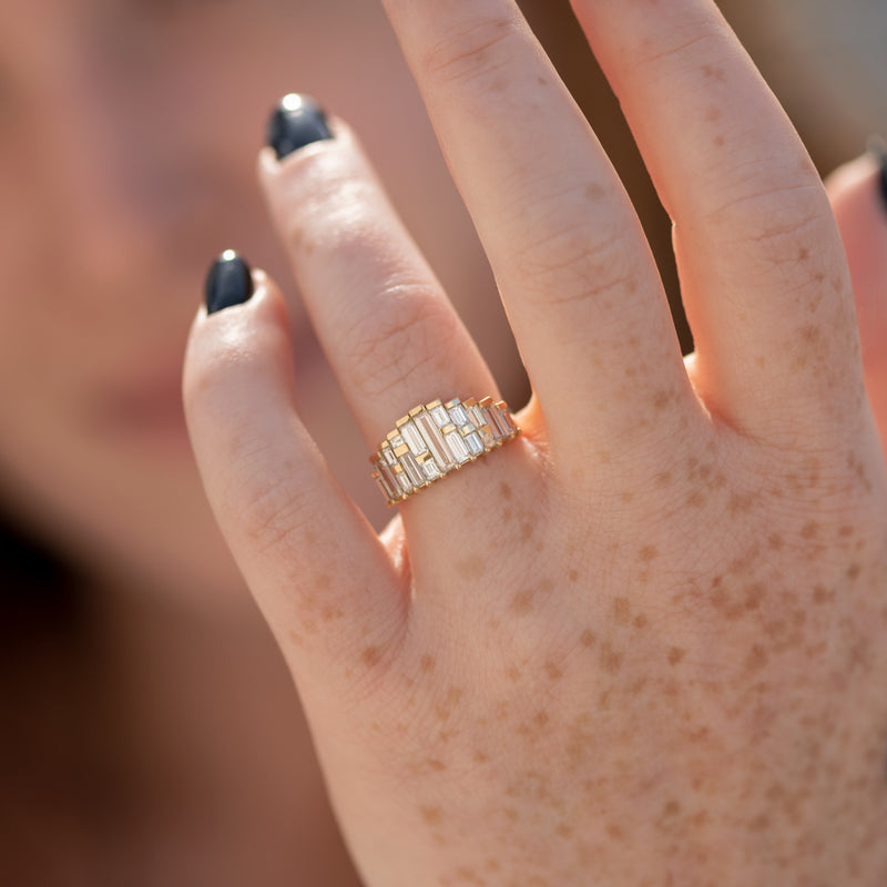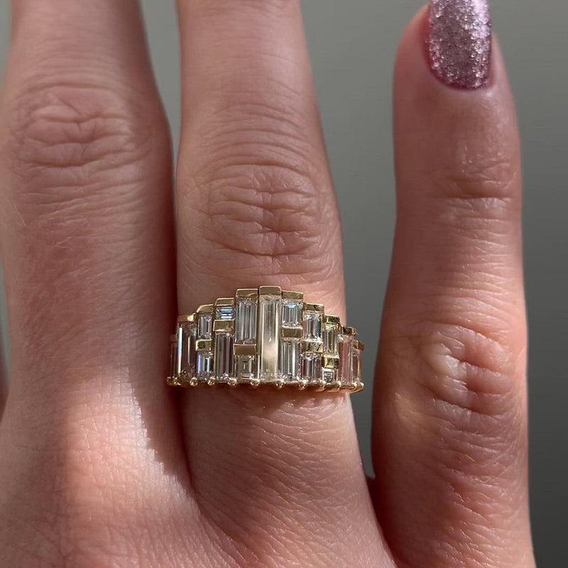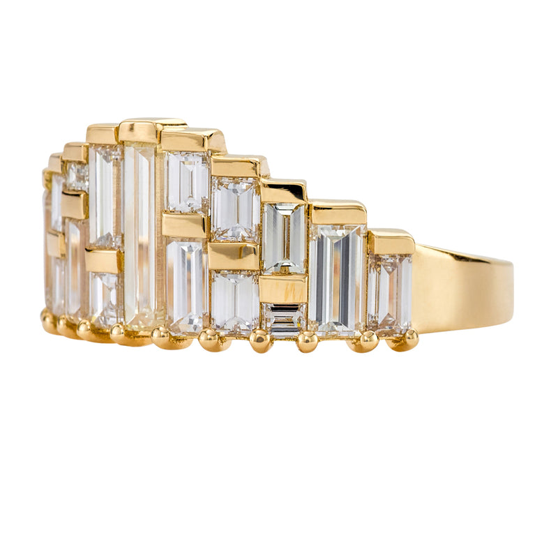 The deco diamond engagement ring with top light brown baguettes is created with top light brown baguettes that are divided with bars of gold, providing a glamourous and architectural aesthetic. Each engagement ring is OOAK and features its own unique composition of baguette TLB diamonds and gold bars.