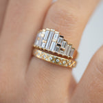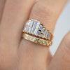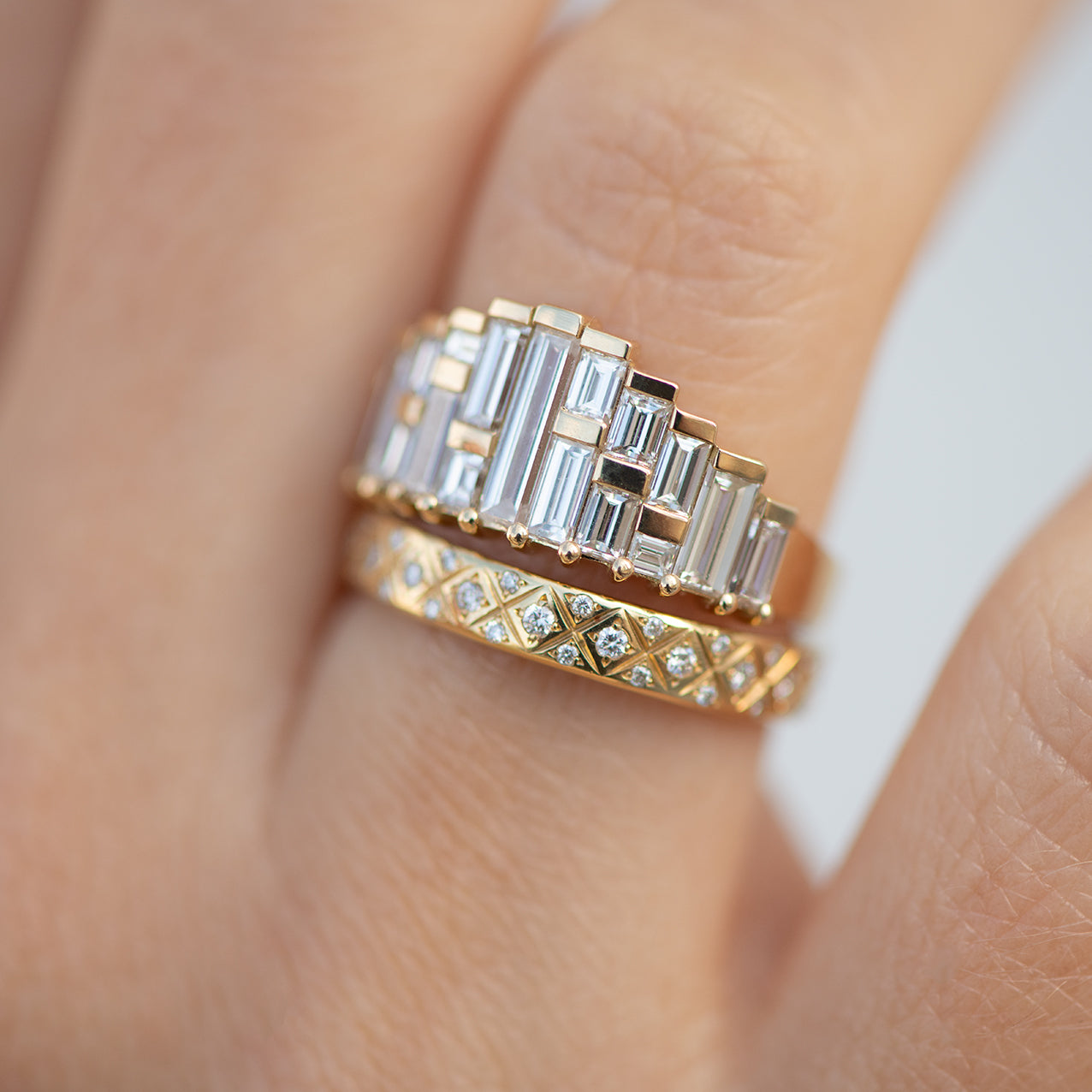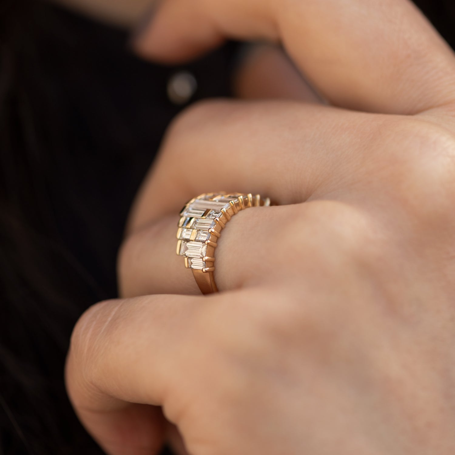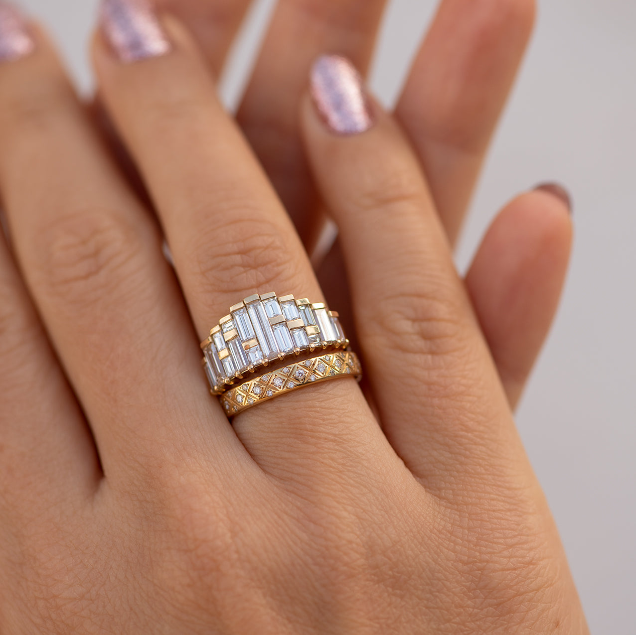 The deco diamond engagement ring with top light brown baguettes is created with top light brown baguettes that are divided with bars of gold, providing a glamourous and architectural aesthetic. Each engagement ring is OOAK and features its own unique composition of baguette TLB diamonds and gold bars.