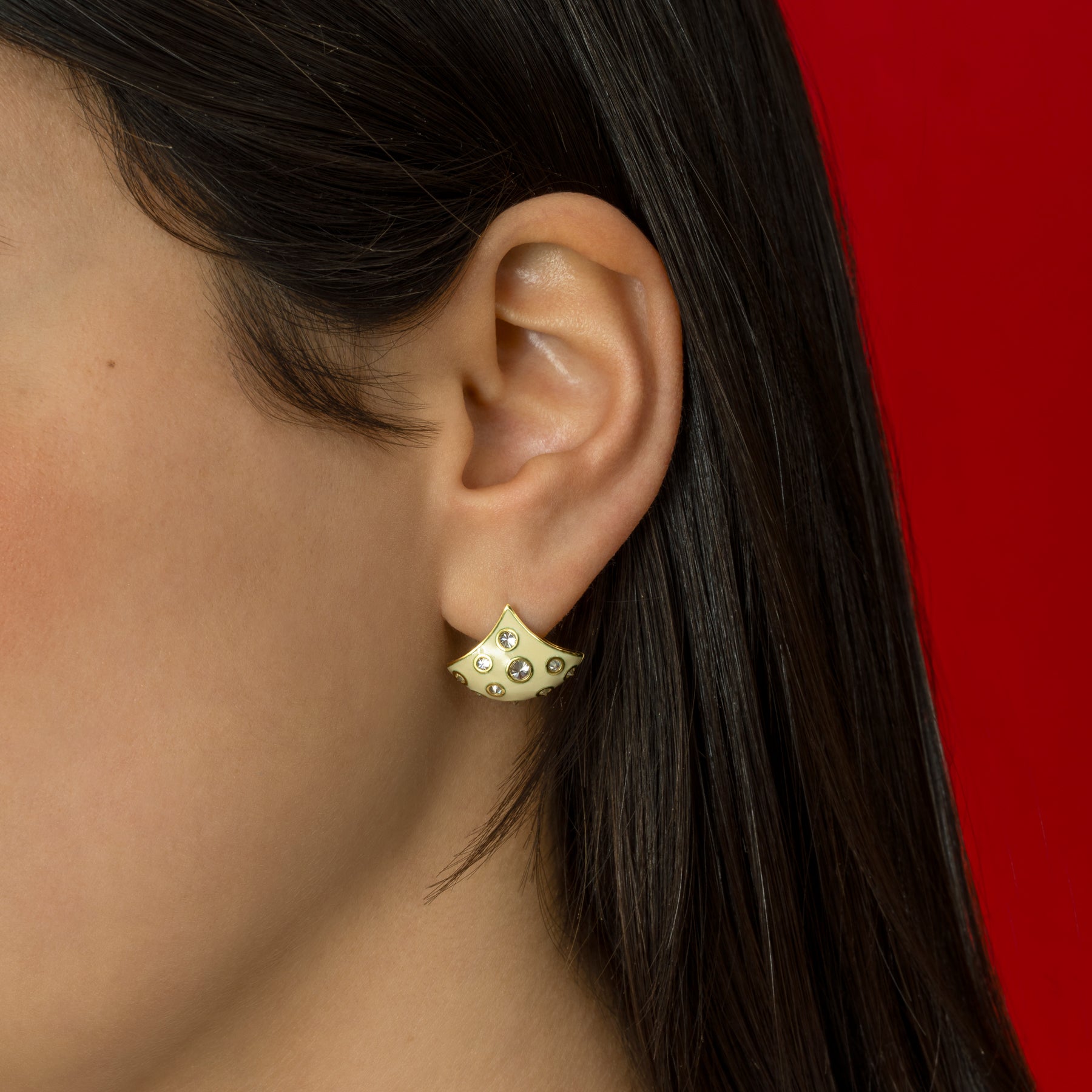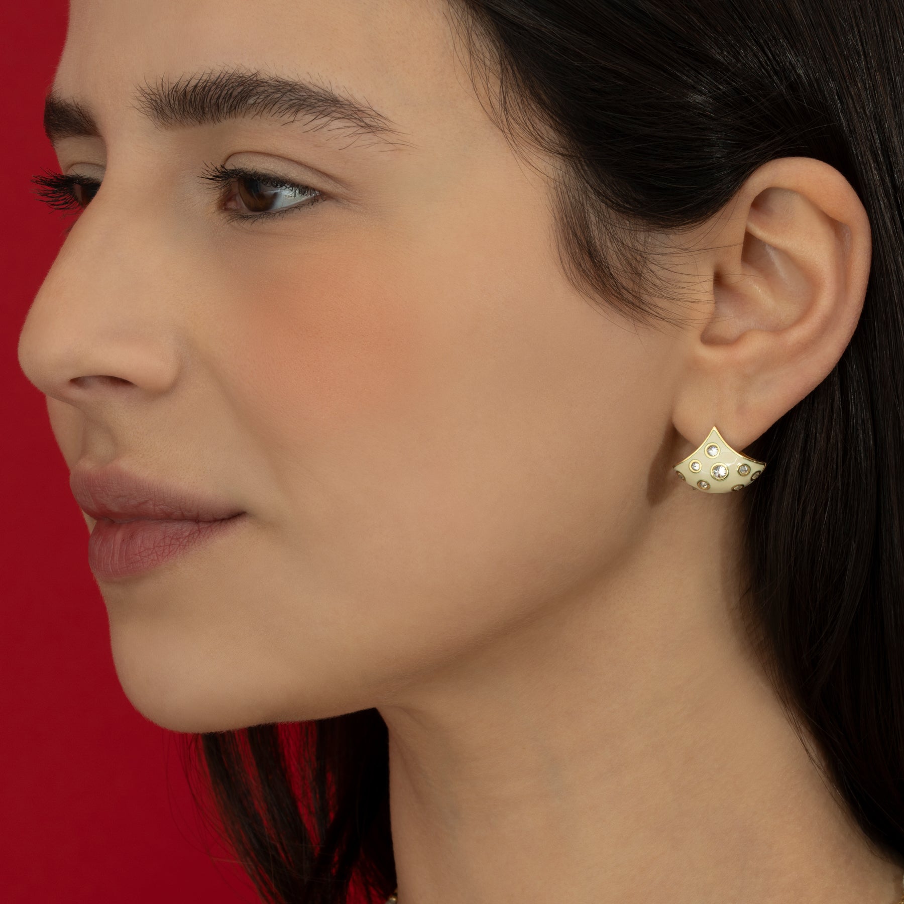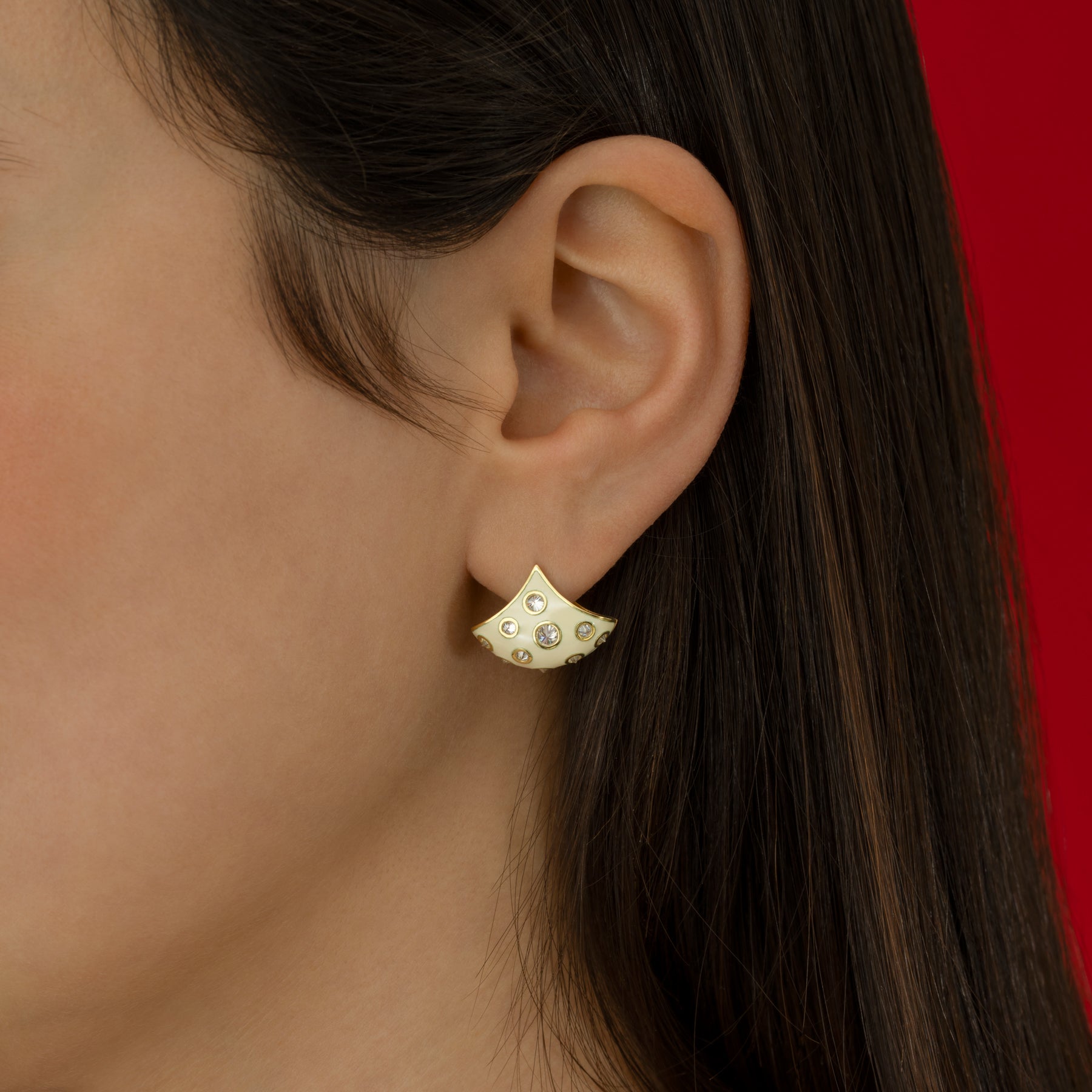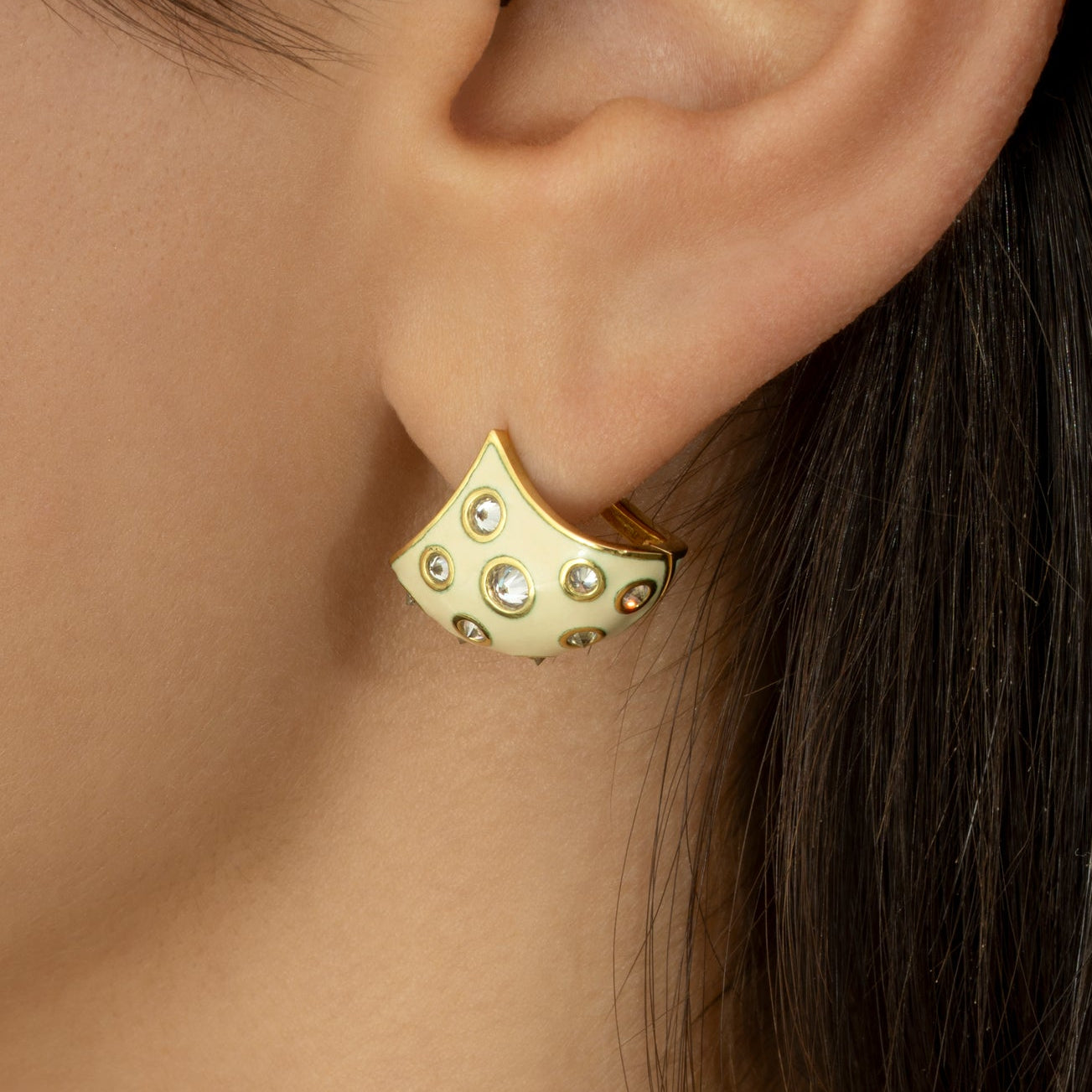 The Enamel Reverse Set White Diamond Fan Earrings are handcrafted in our studio from 18K gold. In this design, brilliant white are reverse set into a hand coated cream enamel surface. Gold detailing around each diamond adds an extra touch of shine. These earrings add polished edge to any look.