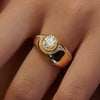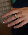 The Fancy Yellow Brilliant Diamond Engagement Ring is handcrafted in our studio from 18K gold. This new take on a bombe ring features a 1.5ct fancy light yellow diamond set into a chunky asymmetrical band. Glittery tiny brilliant diamonds trace the shape of the central diamond.