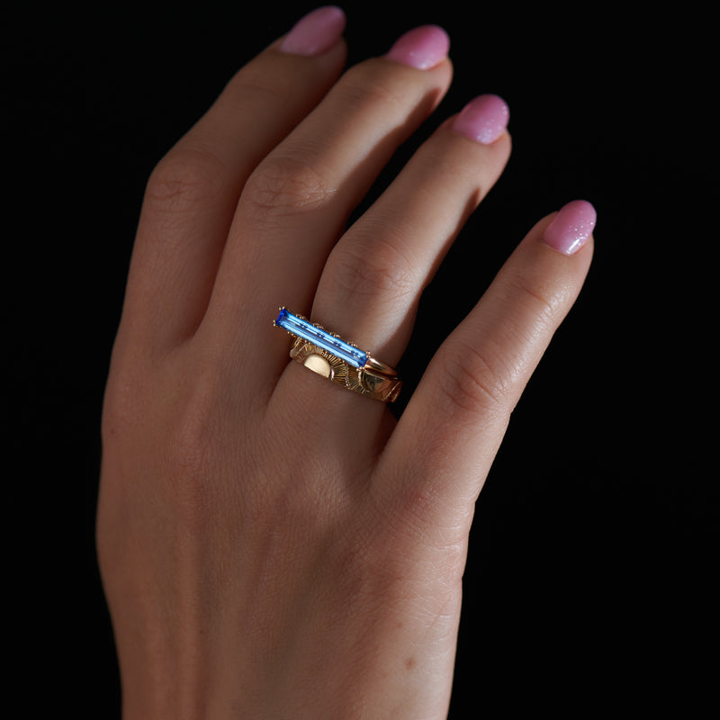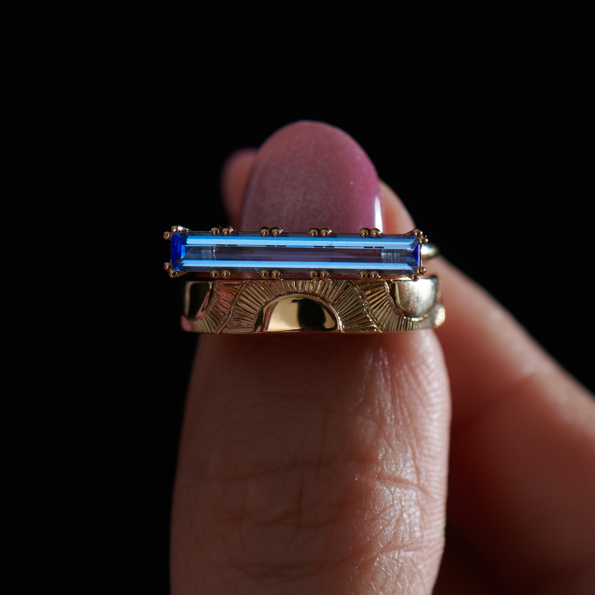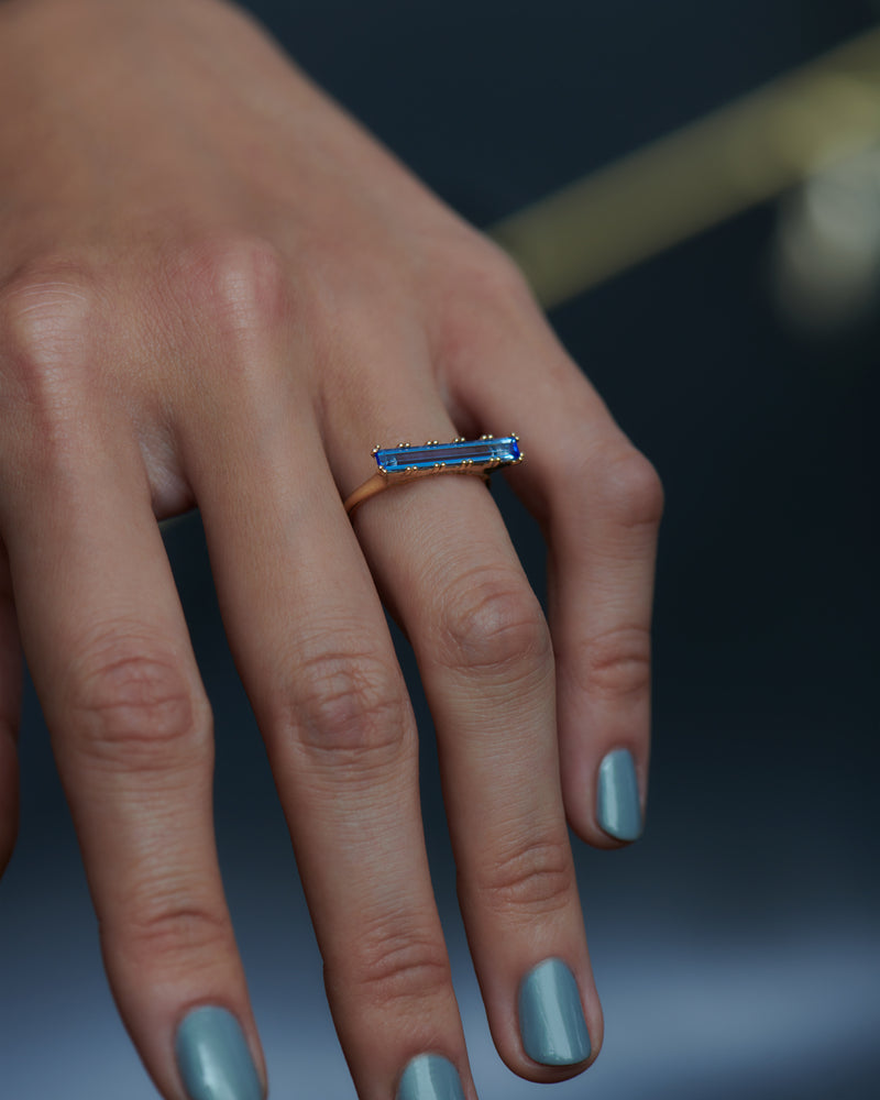 The lab grown sapphire long baguette statement ring is a minimalist design with clean, elegant lines. This design features an extraordinary light blue sapphire baguette in a length that is only possible when lab grown. This statement piece adds an edgy touch of color to any collection.