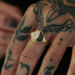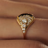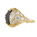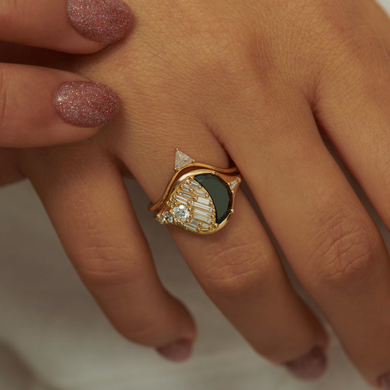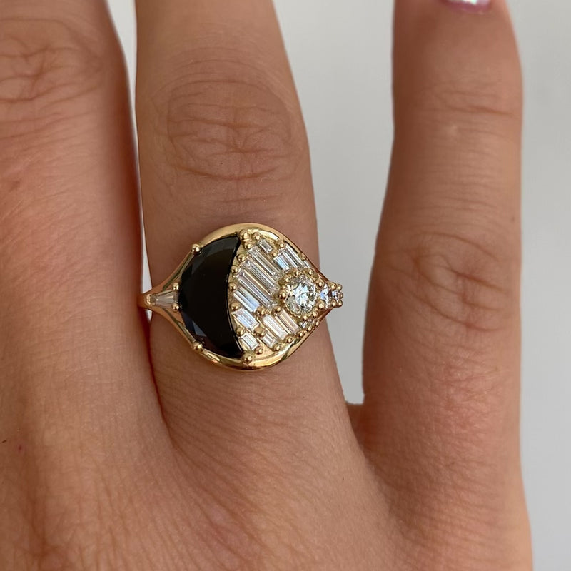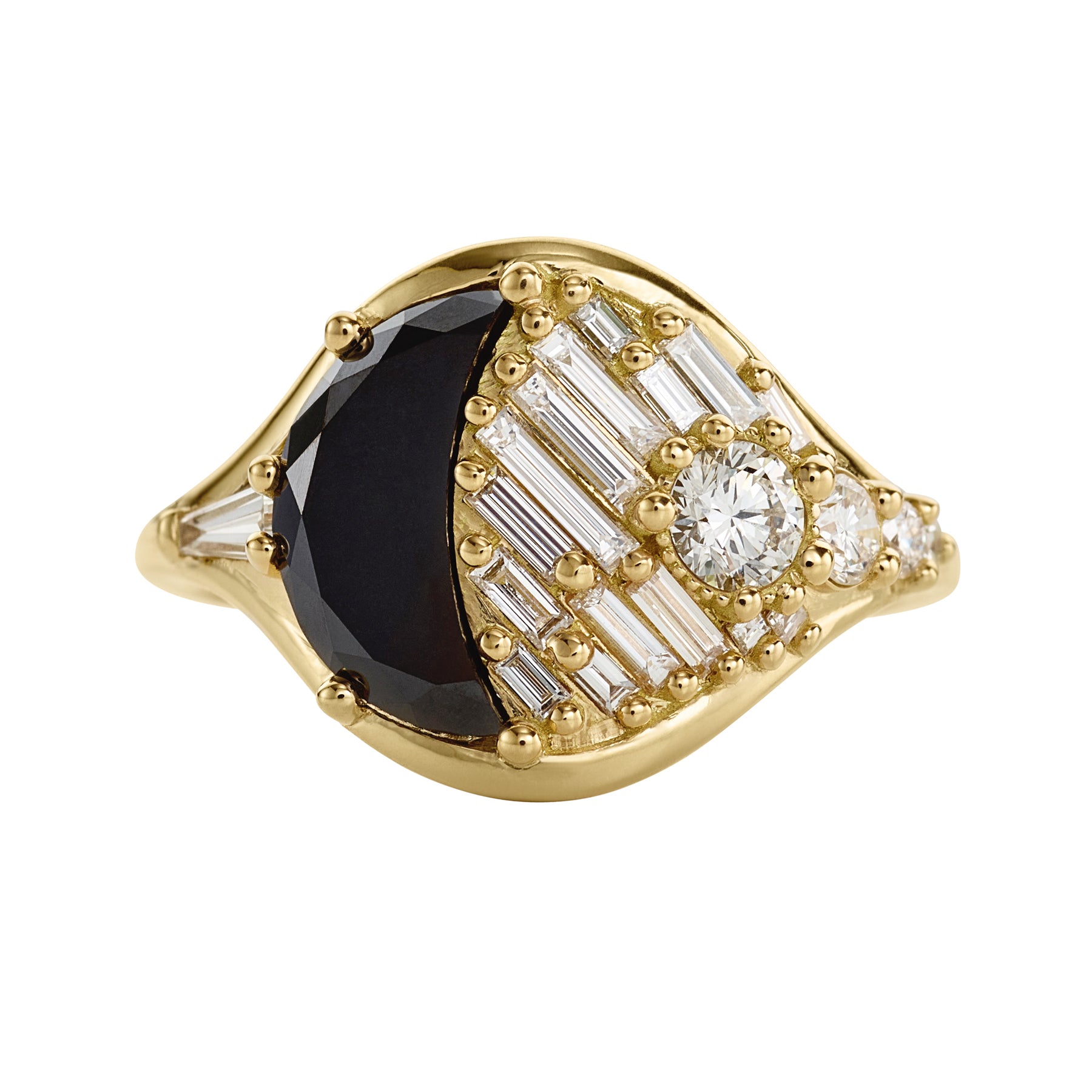 The New Moon Black Diamond is hand-crafted and hand-polished from 18K gold.  A jet black half moon diamond is set next to an assemblage of baguette cut diamond as four brilliant diamond descending in size trail off towards the band. A tapered baguette diamond set on the opposite shoulder balances out the other side.