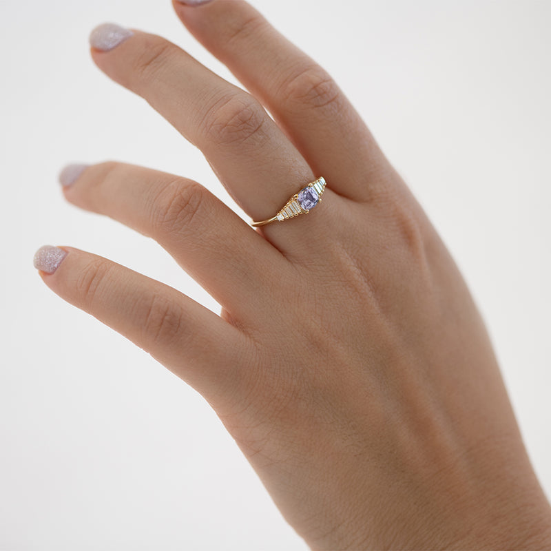 The sapphire engagement ring with baguette diamonds features a vibrant and dynamic purple sapphire paired with the symmetrical gradient of baguette diamonds.