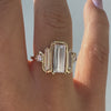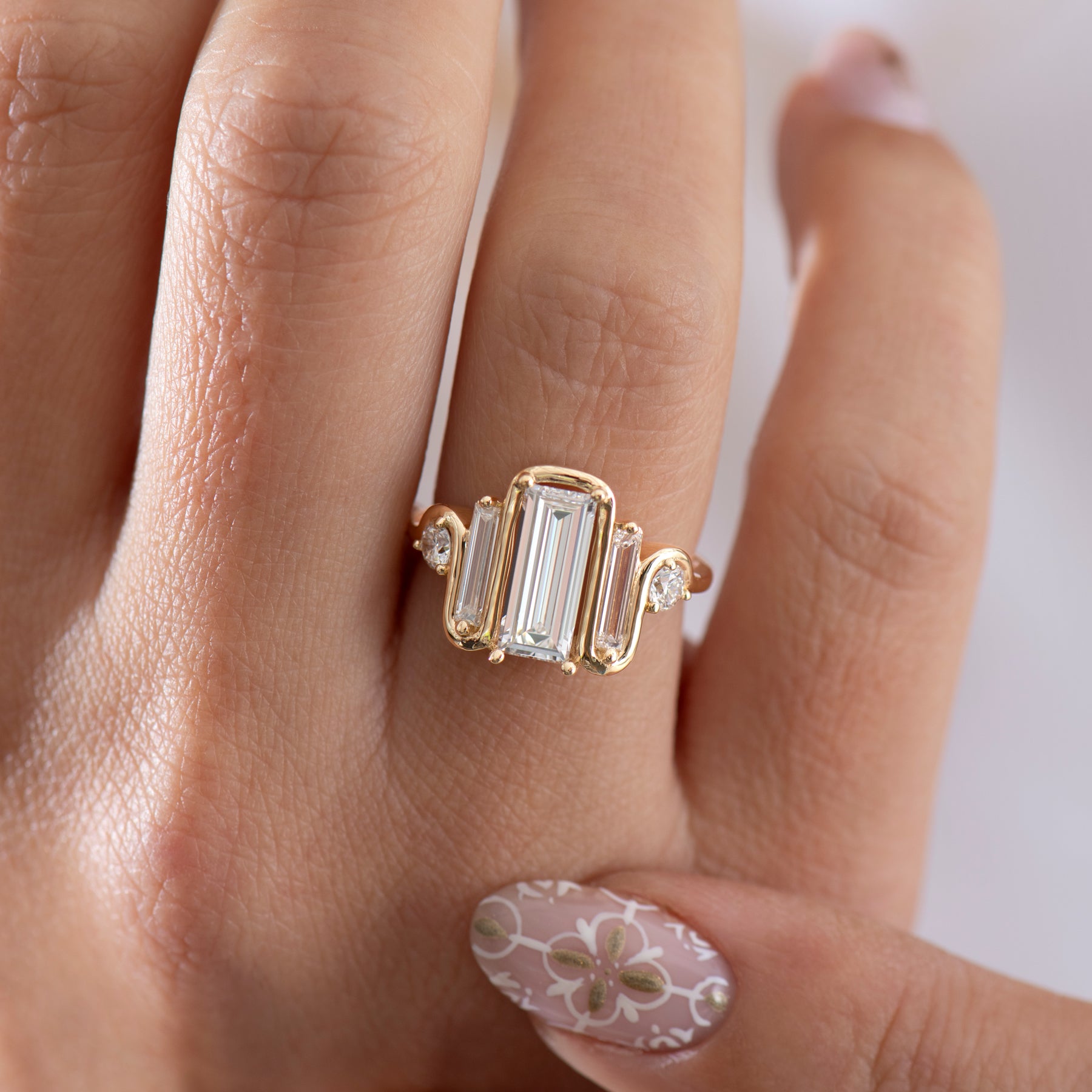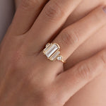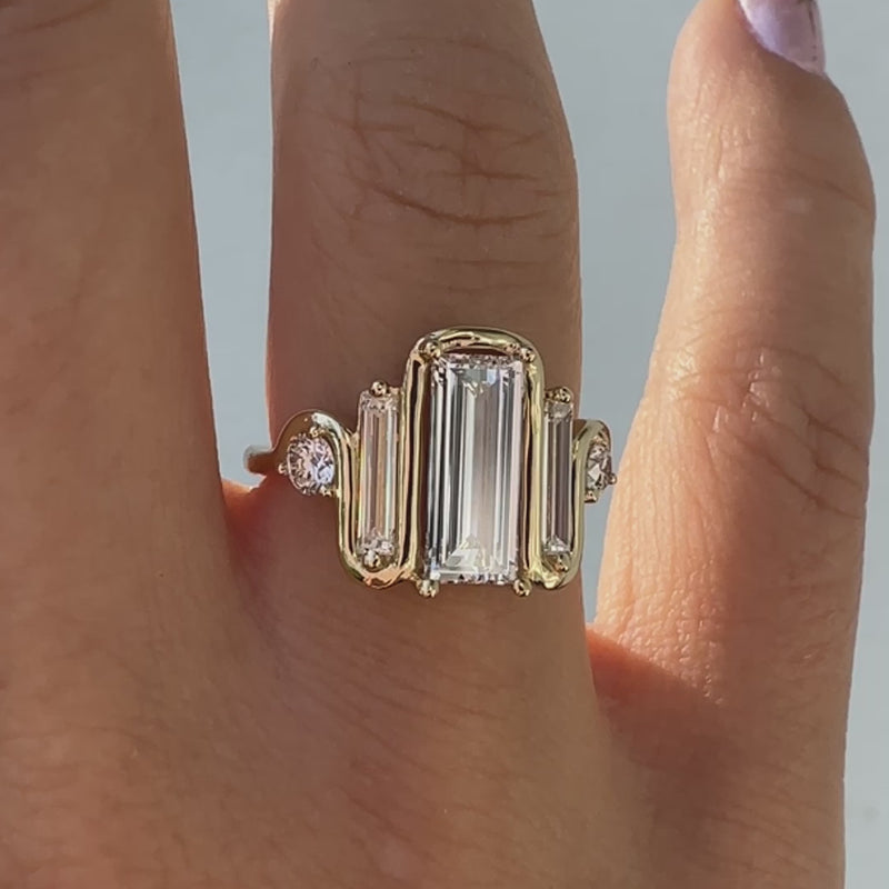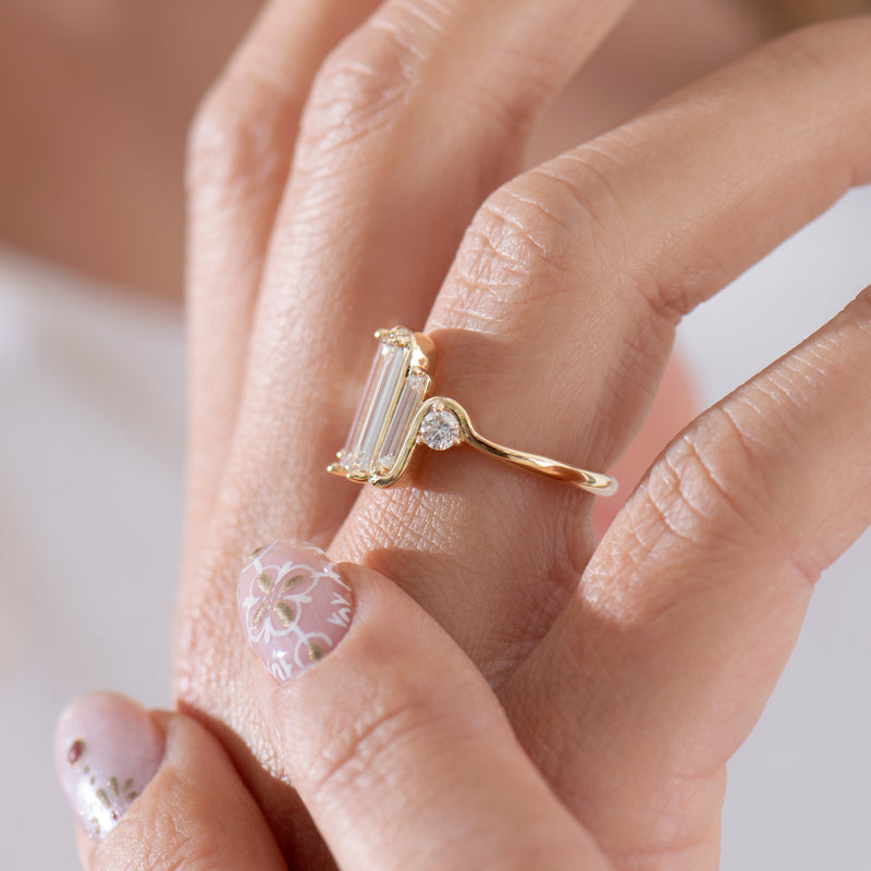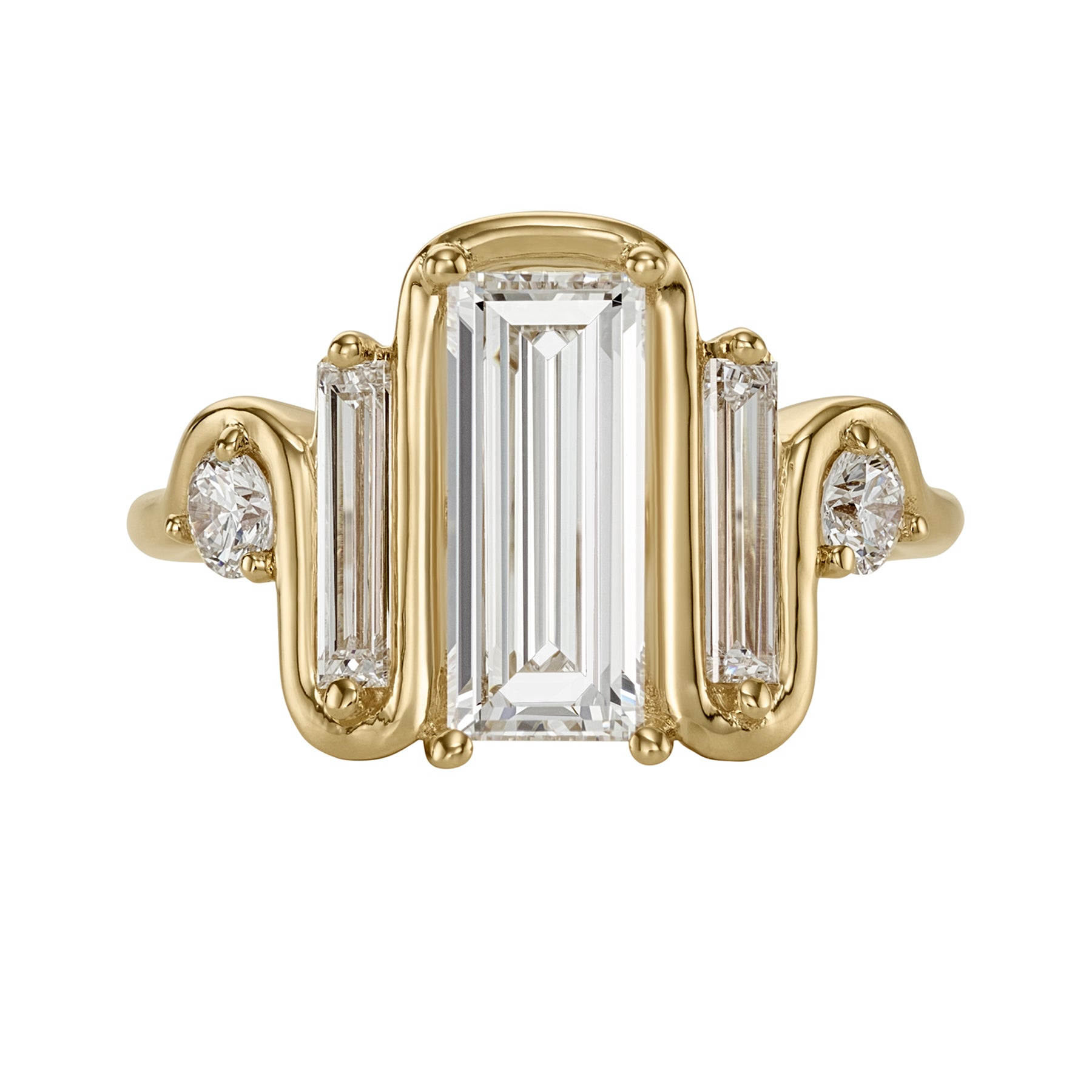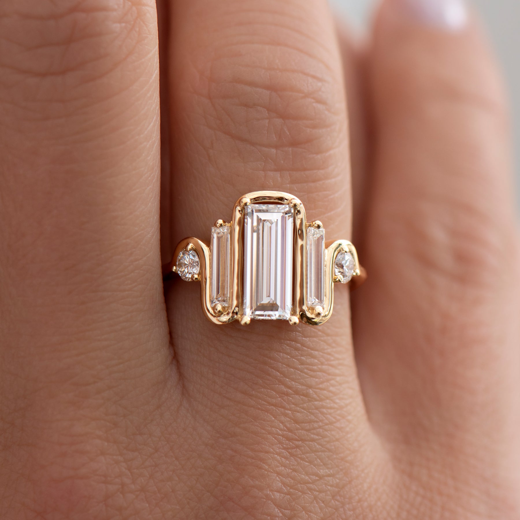 The Triple Baguette Diamond Wave Ring (Large) brings together graceful movement and architectural form. An ~1.2ct baguette cut diamond sits at the center, mirrored by pairs of slender baguette and brilliant-cut stones on either side. A ribbon of 18K gold weaves through and around the diamonds, creating a fluid, sculptural silhouette. Seen here in a set with the Wave Solid Gold Wedding Band, this ring is perfect for the alternative bride.