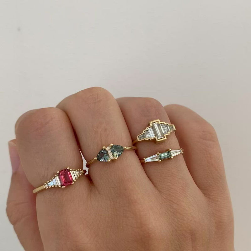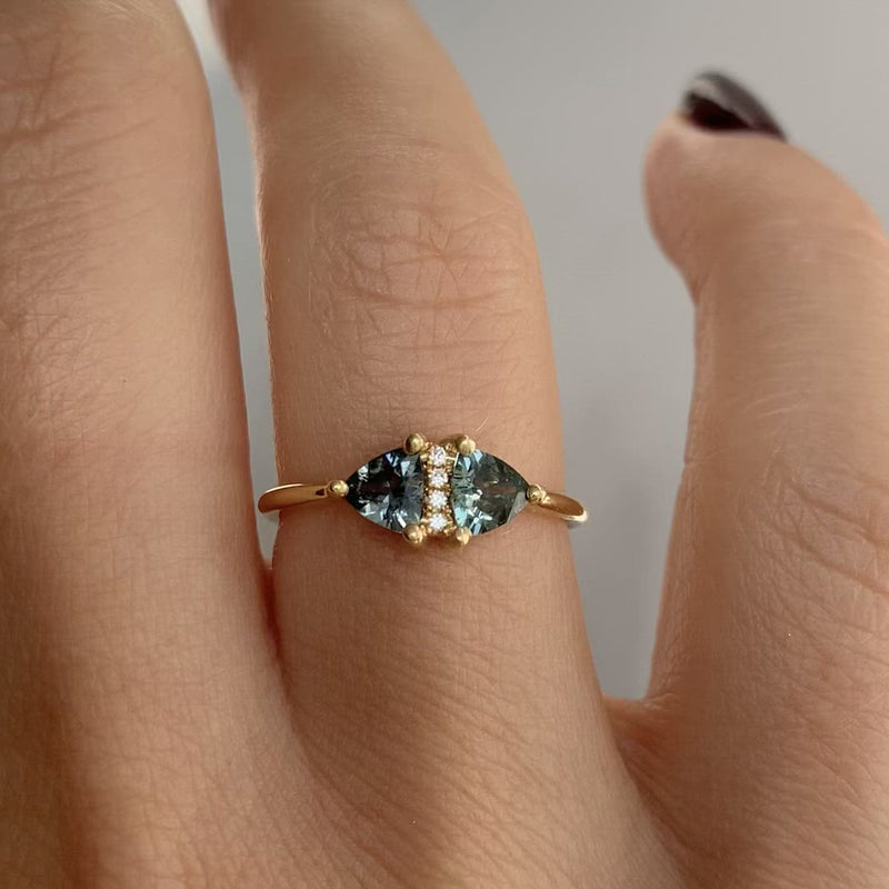 This vintage style engagement ring with trillions and brilliant diamonds represents a colorful twist on tradition. Two trillion cut gemstones are delicately set into a golden band and a pave of brilliant cut white diamonds completes the design.