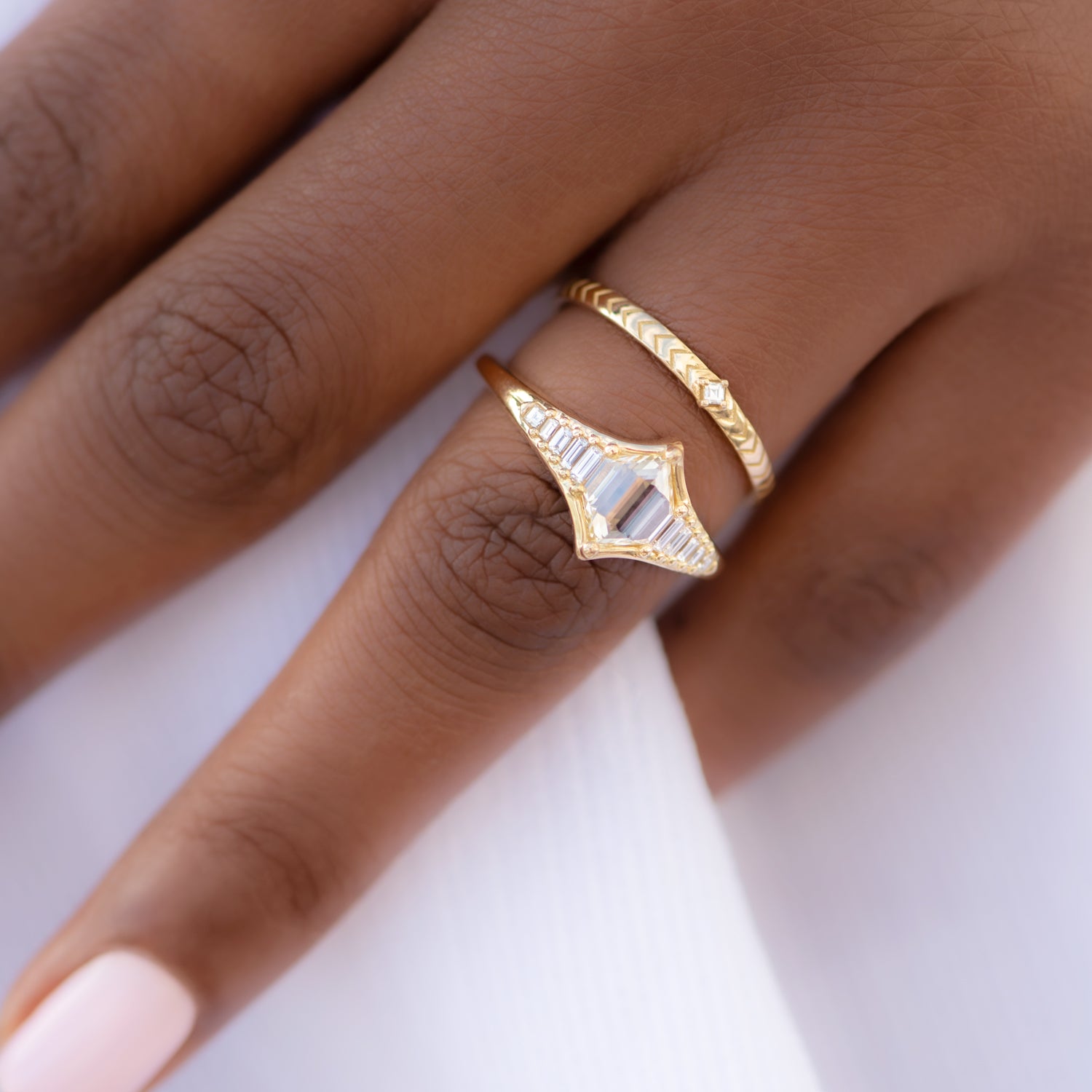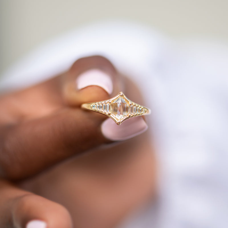 18k gold | 0.7 carat duchess shape hexagon step cut diamond (OOAK) | assemblage of 10 gradient in size baguette and carre cut diamonds