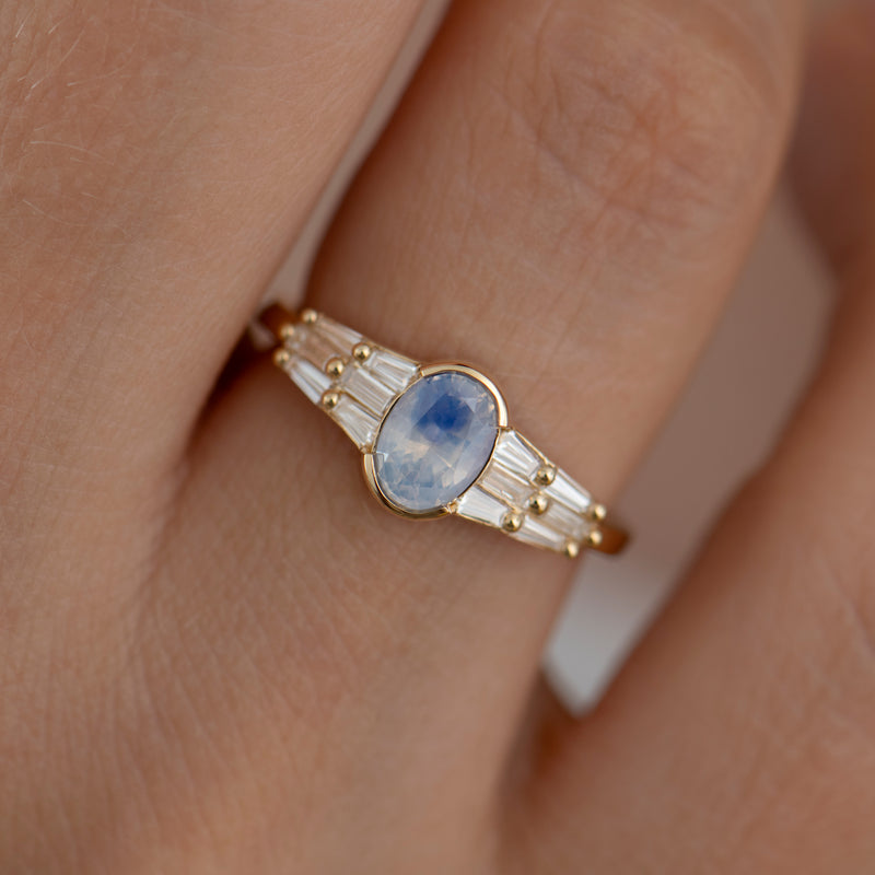 18k solid gold | Oval cut Parti Sapphire | Assortment of tapered baguette diamonds