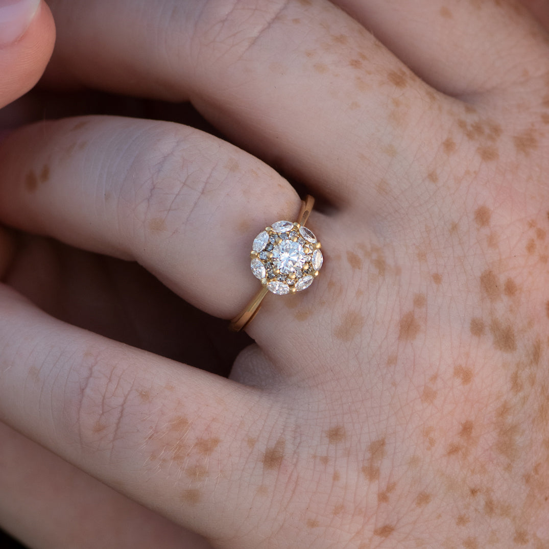 Golden Lotus Engagement ring with Grey and White Diamonds
