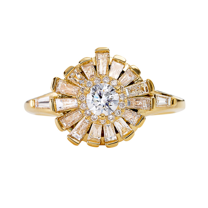 The Sun Temple Ring with Tapered Baguette Diamonds Halo
