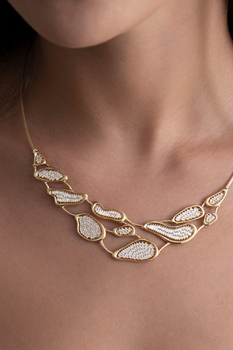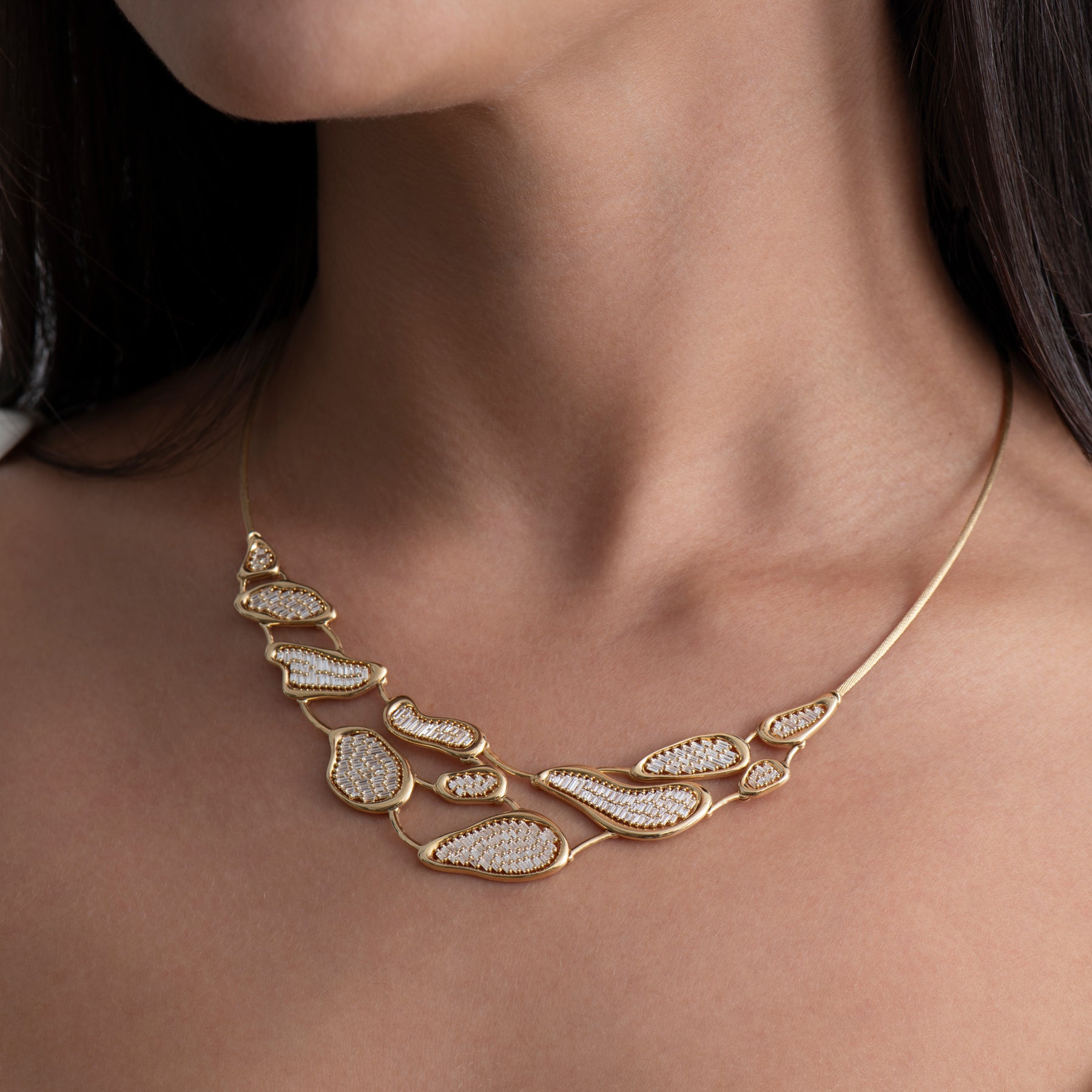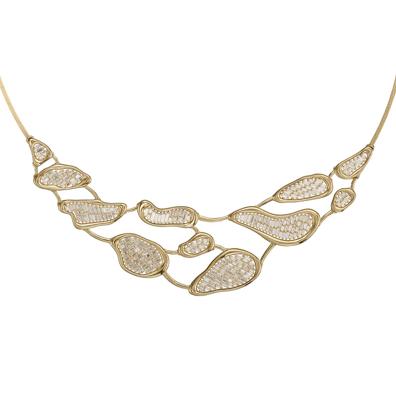 The Diamond Lakes Fluid Shape Statement Necklace is a show stopping design. Lovingly crafted in our studio from 18K gold, this necklace features lakes of glittering baguette diamonds traced by ribbons of gold with gleaming rivulets connecting each pool. Full of sparkle and fluid movement, The Diamond Lakes Fluid Shape Statement Necklace is a truly special piece.