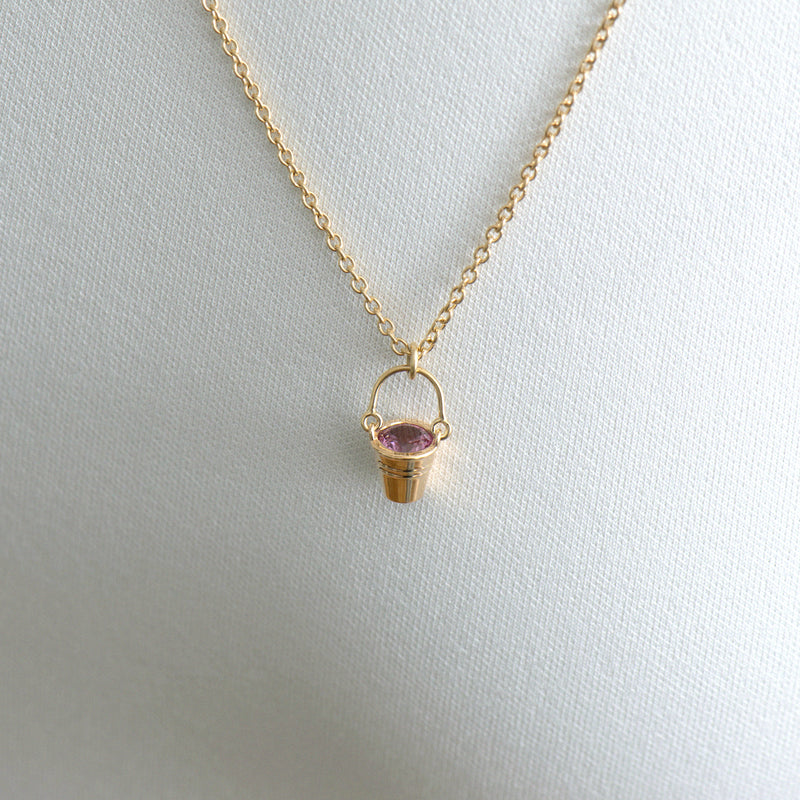 The Gold Bucket Pendant Necklace with Sapphire is lovingly handcrafted in our studio from 18K gold. In this design, a little gold bucket pendant is filled with a gem to create glowing "water." Strung on an extra long chain, this playful piece is perfect for layering.