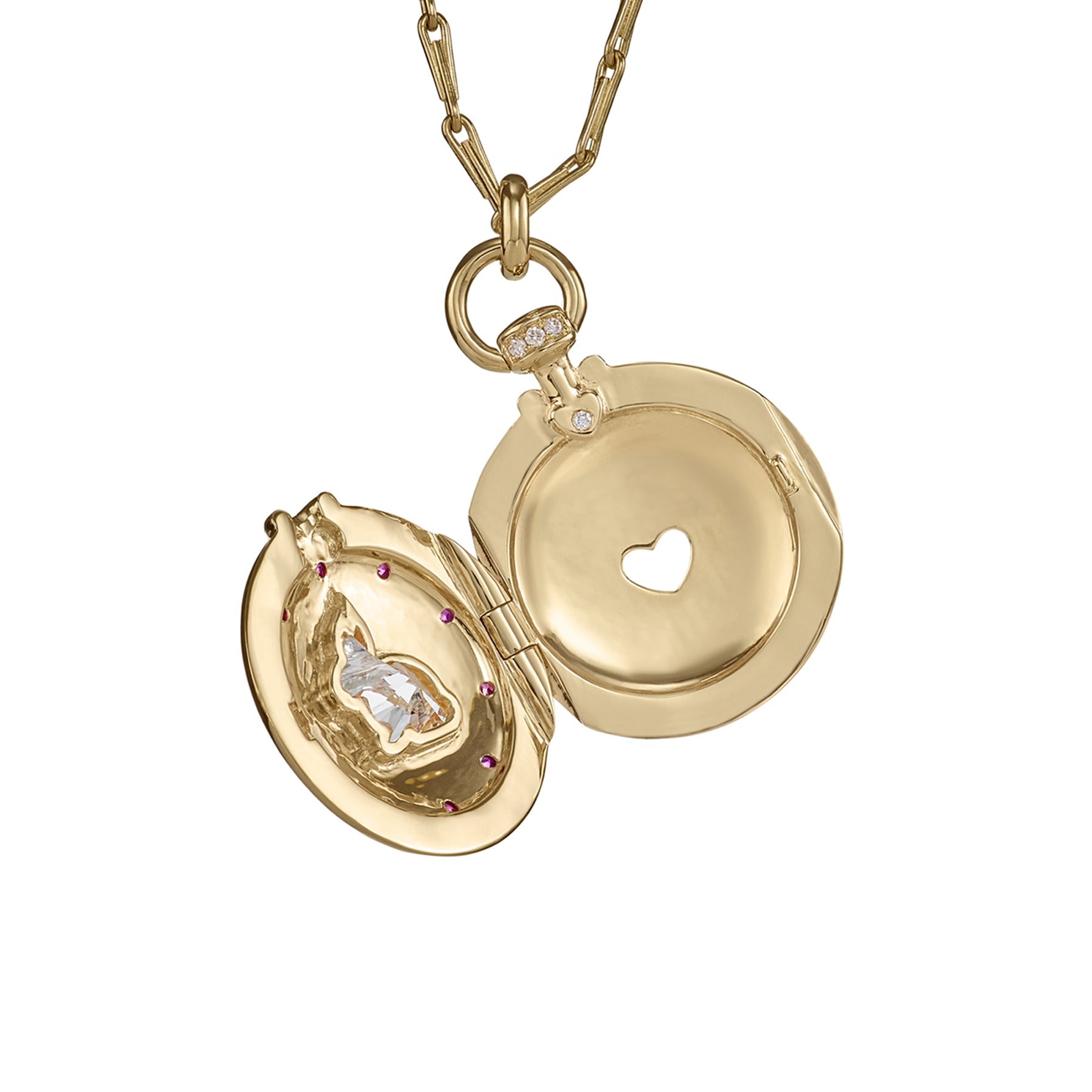 The Gold Locket Necklace with Rabbit Shaped Diamond & Pink Sapphire Florals is a locket designed to feel both nostalgic and magical. Set in 18K gold, a rabbit-shaped diamond rests within a wreath of pink sapphire flowers with hand-engraved leaves. A diamond-accented bail crowns the piece, while a heart-shaped cutout on the back and a tiny hidden diamond inside add sweet, unexpected details. This little storybook treasure keeps a token of your loved one close to the heart.