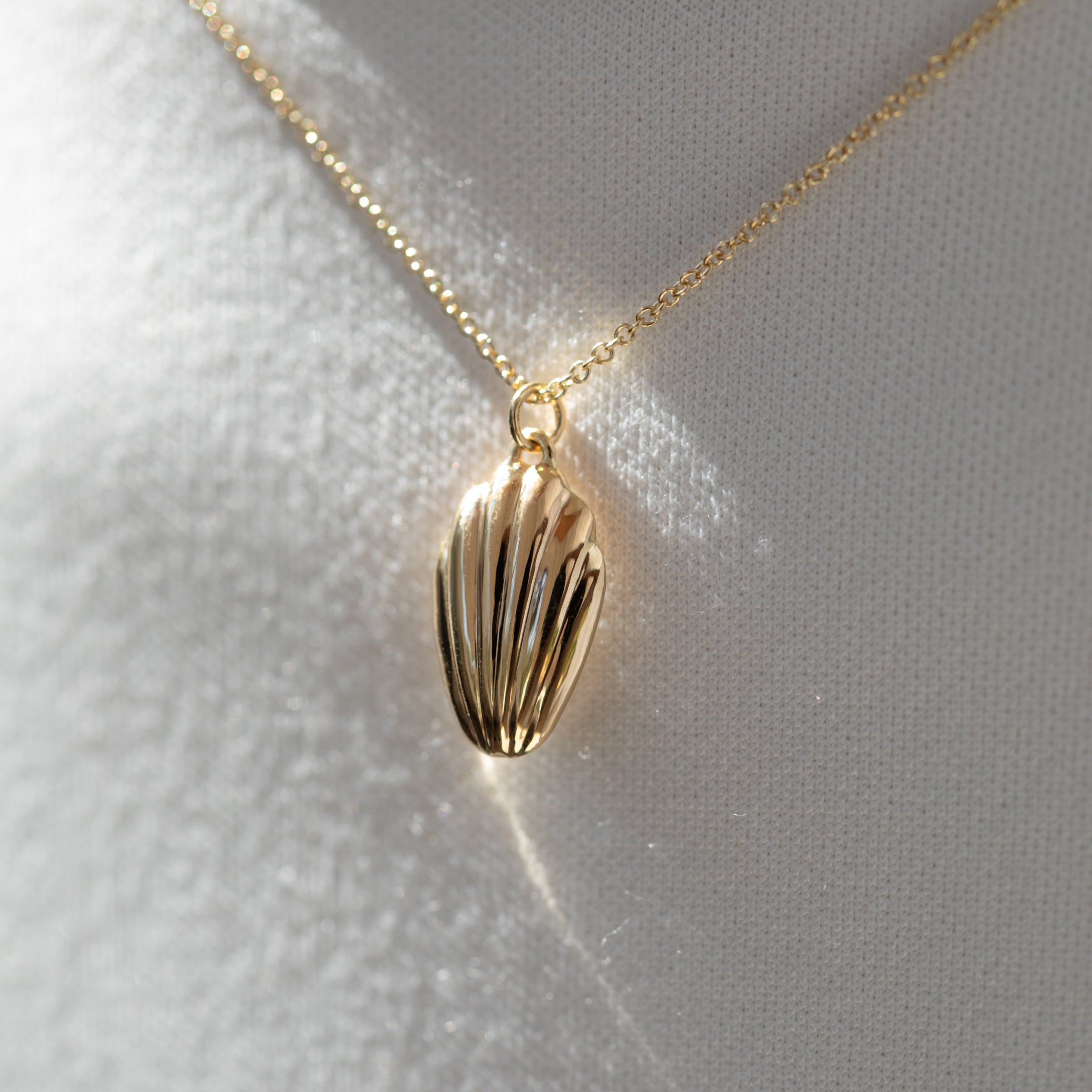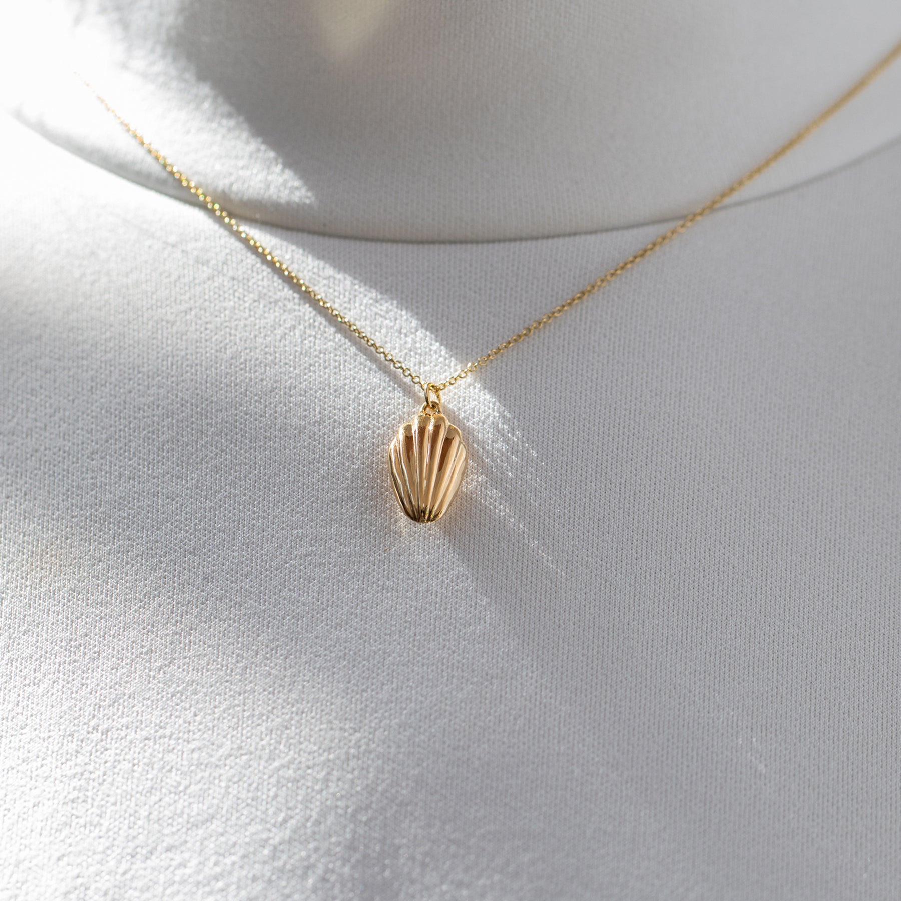 The Madeleine Cookie Pendant Necklace in Solid Gold is a wistfully romantic piece . This necklace is inspired by In Search of Lost Time by Marcel Proust. In the novel, the narrator remembers an episode from his childhood after tasting a soft little madeleine cookie. Something so seemingly small and simple had the power to bring to mind such a strong memory. This necklace is a sweet and delicate addition to any collection.