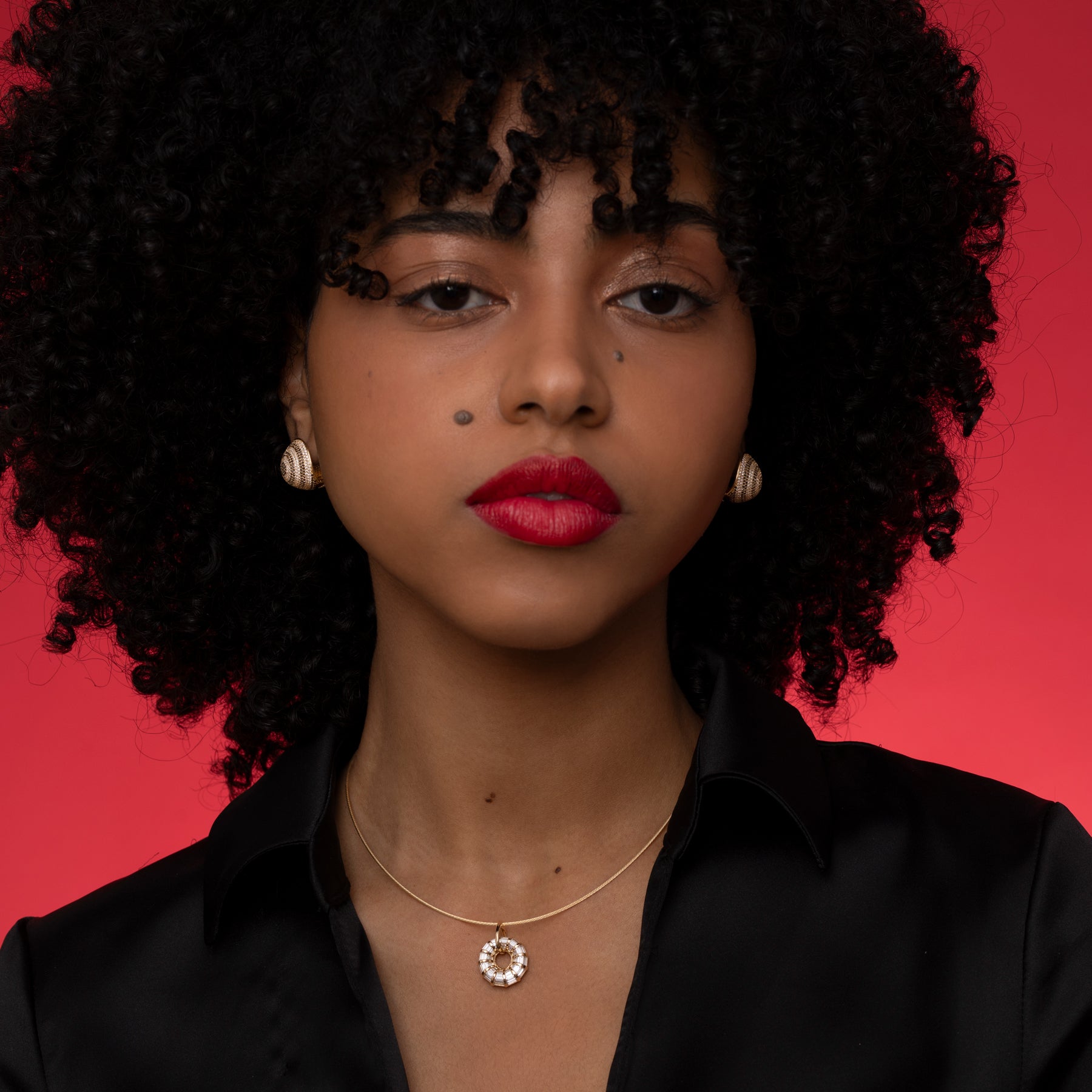 The Nimbus Diamond Pendant Necklace in 18K Gold is a bright and eye-catching piece. Handmade from 18K gold, this necklace features custom cut trapeze diamonds arranged in puffy ring-shape with an asymmetric cut out in the middle leaving a space for a little peek of skin with stripes of gold adding extra glow. Strung on an 18K gold cord, this necklace is a chic addition to any collection.