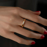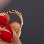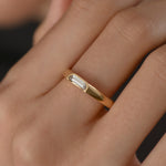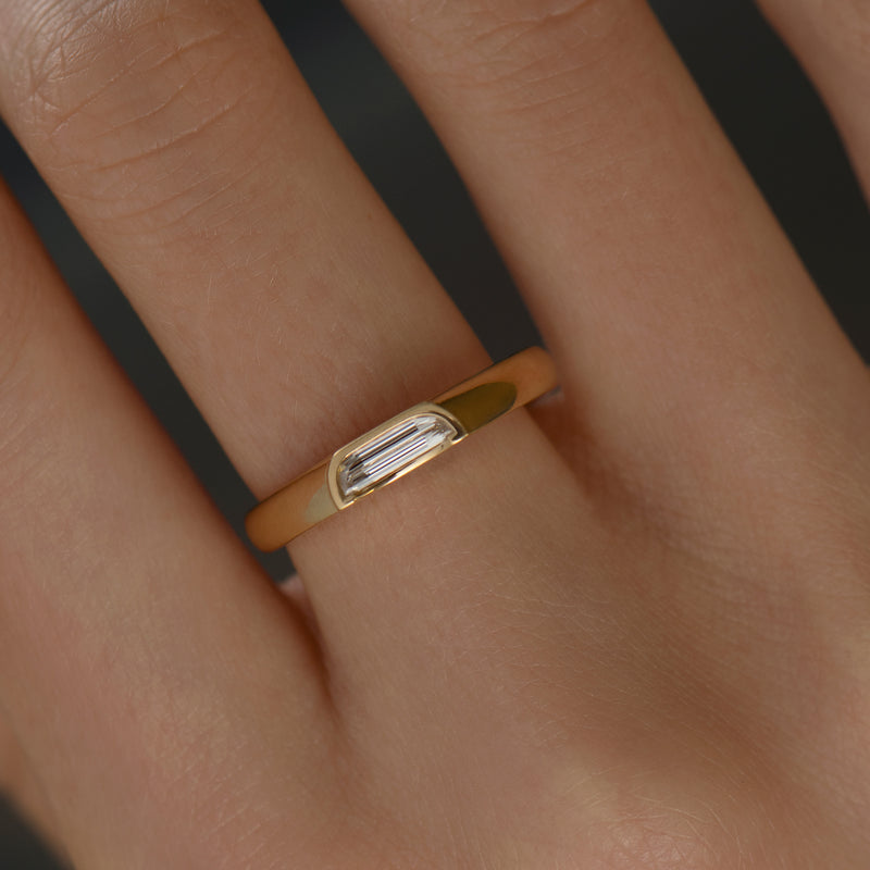 The Minimalist Half Moon Diamond Band is handcrafted in our studio from 18K gold. A sleek half moon diamond is set into a gold bezel while leaving an open edge on one side nestling the stone in just the right amount of gold. Sleek and minimalist, this ring is perfect for stacking.