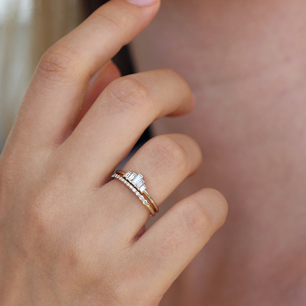 A beautiful bridal set featuring five gleaming baguette diamonds and a diamond wedding band. A truly special pairing, this enchanting set is full of allure and vintage flare.