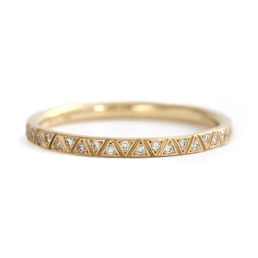 Triangle pattern engraved diamond eternity ring in solid gold. Unique and dainty wedding ring for the alternative bride.