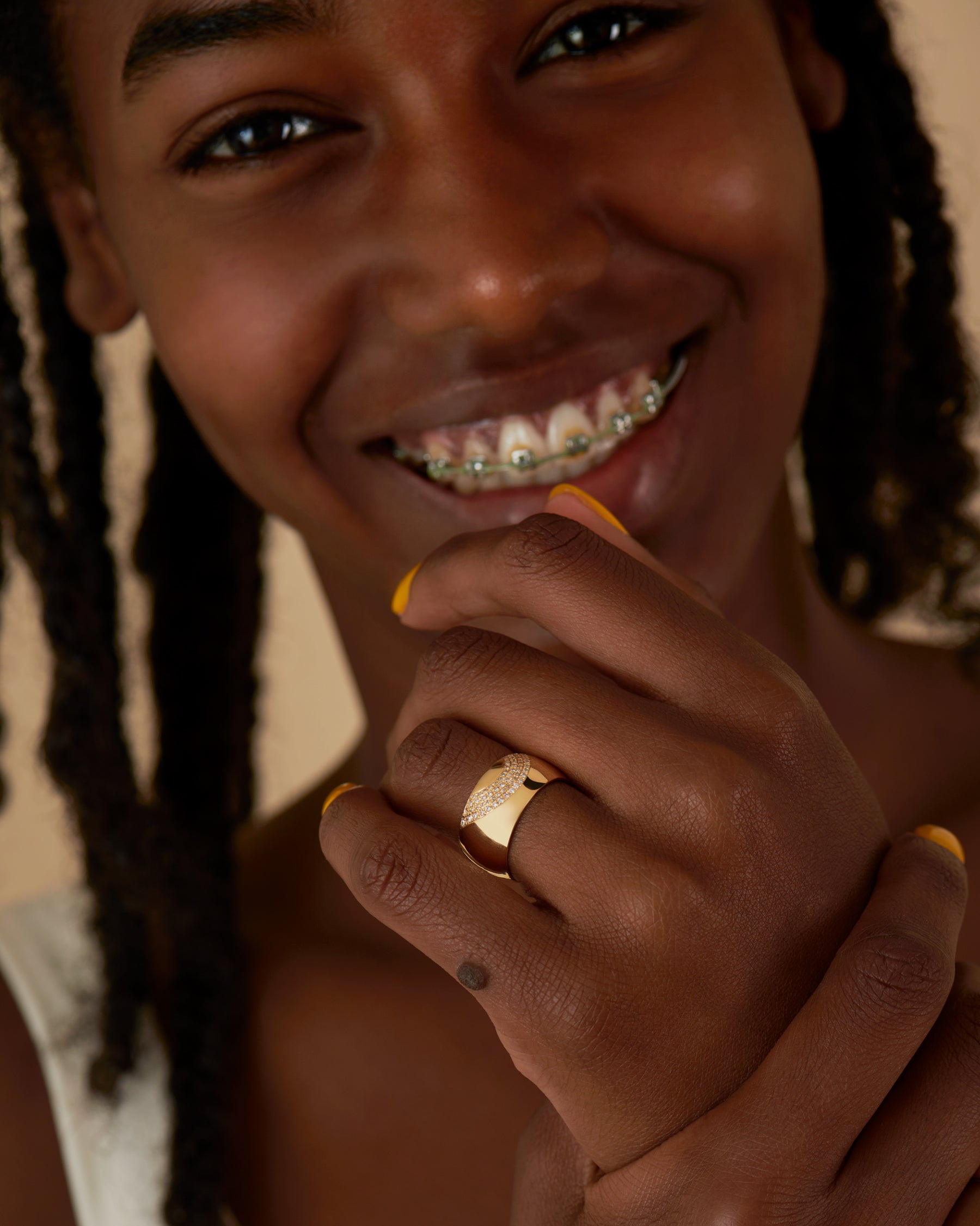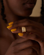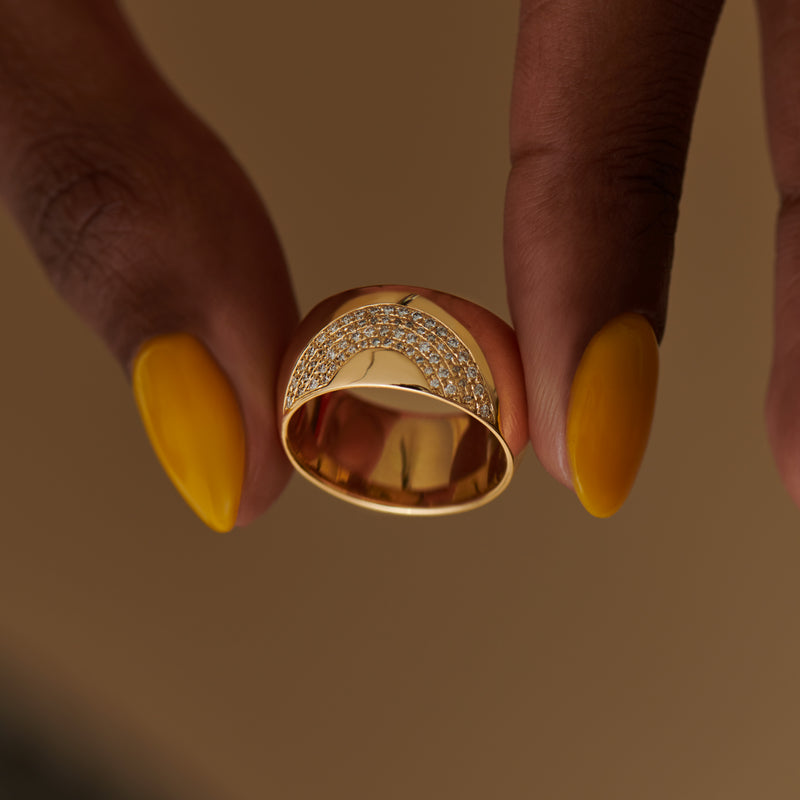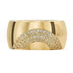 The Arced Diamond Pave Chunky Cigar Band is handmade and cast from solid 18K gold. The curved face of the band is set with three arced rows of shimmering diamonds.  Whether worn alone or stacked, the wide, rounded profile of the ring makes for a striking addition to any jewelry collection.