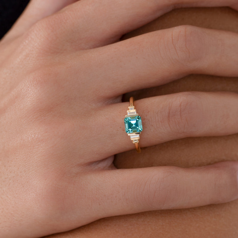 The Atlantis Asscher Cut Tourmaline Solitaire Engagement Ring is handcrafted in our studio from 18K gold. A bright aqua asscher cut tourmaline takes center stage with two sets of baguette diamonds on each side. Sleek and streamlined, this ring adds an elegant element of color to your stack.