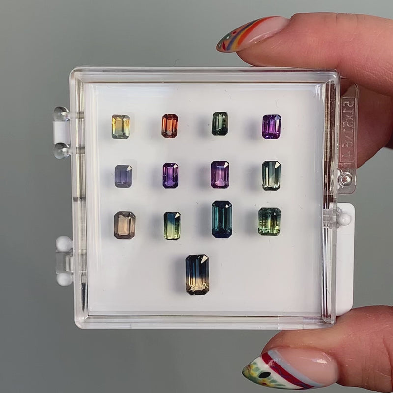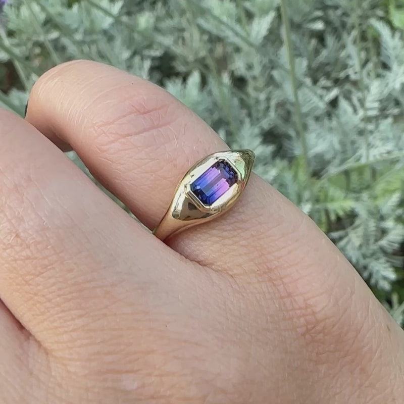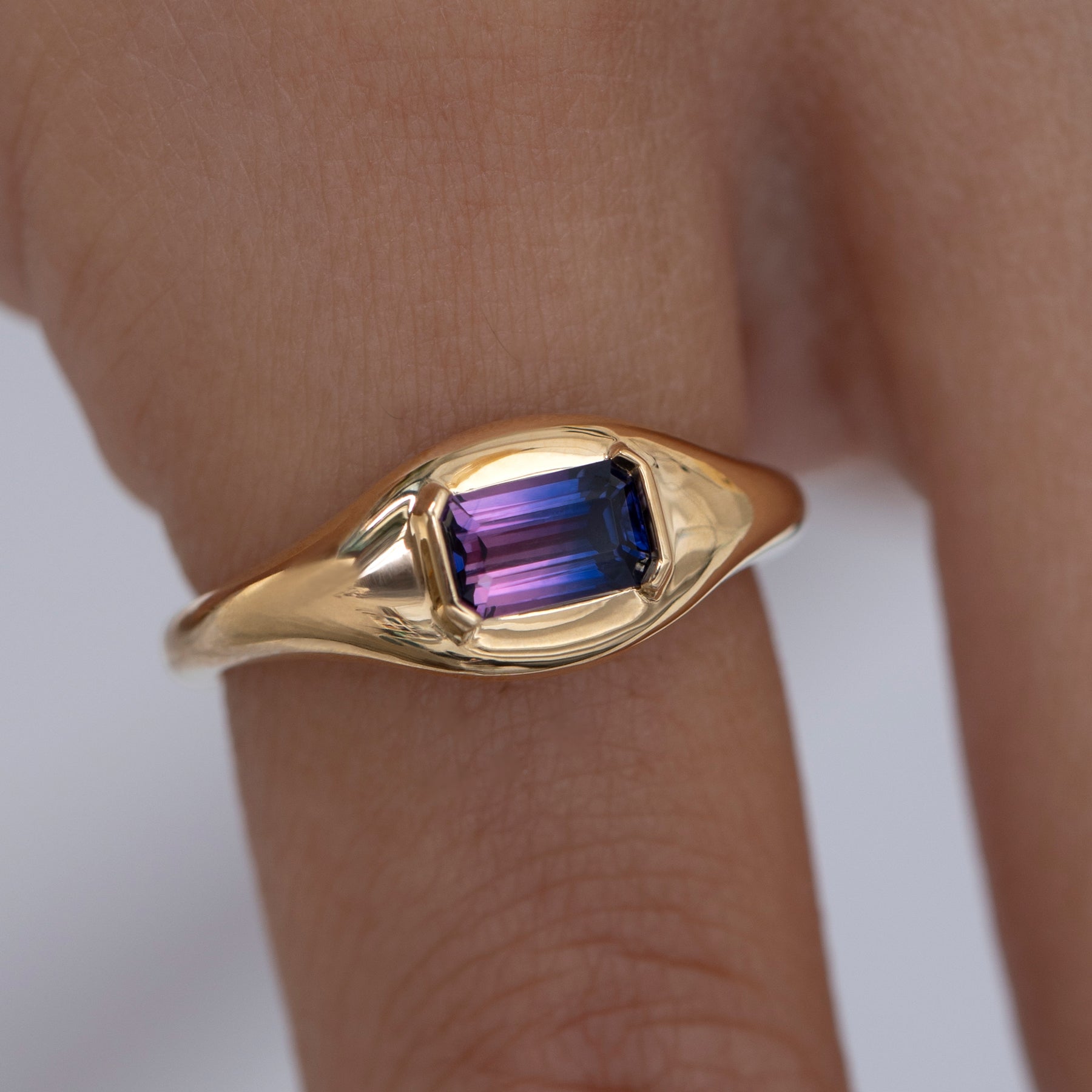 The Chameleon Parti Sapphire Signet Pinky Ring is a fun and versatile piece. Handcrafted from 18K gold, this pinky ring features a striking emerald-cut parti sapphire available in an array of colors. Perfect for adding a unique touch to your collection.