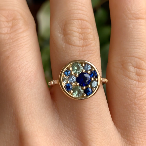 - Customized with green and blue brilliant cut sapphires in the cluster