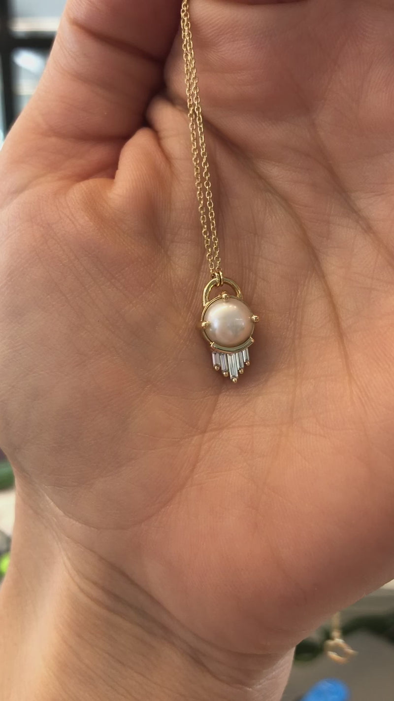 The necklace is made with a glowing white pearl and surrounded with a chevron of five needle baguette diamonds.