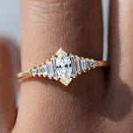 The dainty deco engagement ring with marquise diamond elegantly combines curved lines with straight ones. This ring features a lineup of multiple sized baguette diamonds that frame an exquisite marquise cut diamond.