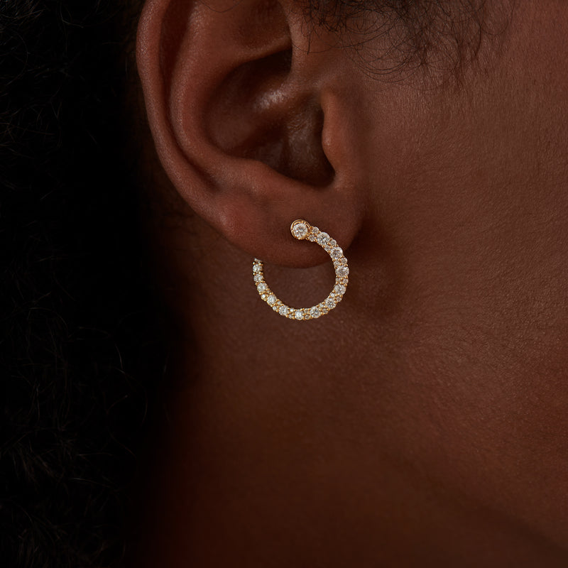 The Ellipsis diamond spiral earrings add a chic dose of sparkle as they elegantly curl around your ear. Cast from polished 18-karat gold, these hoops are set with shimmering brilliant diamonds that descend in size with pairs of tiny round diamonds nestled between each diamond. These earrings are a staple for any collection.