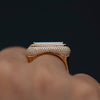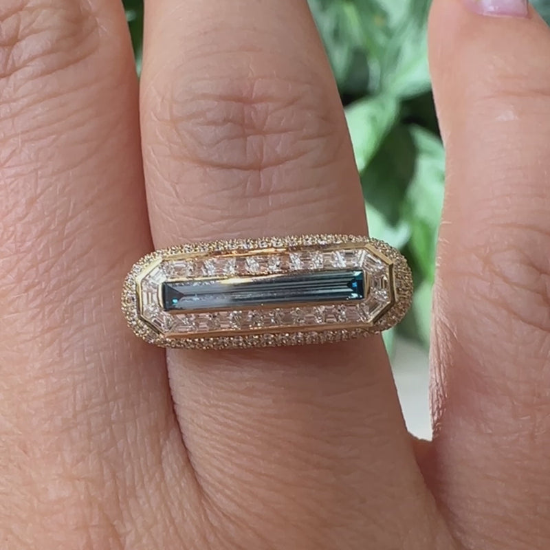 The Fancy Color Blue Diamond Ring with Pave Diamond Detailing is handcrafted in our studio from 18K gold. This ring features a color treated fancy deep green-blue rectangular step cut diamond nestled in a bed of precision cut trapeze and pave diamonds. The sleek lines of this design accentuates the diamond's exceptional 13mm length and dreamy color.