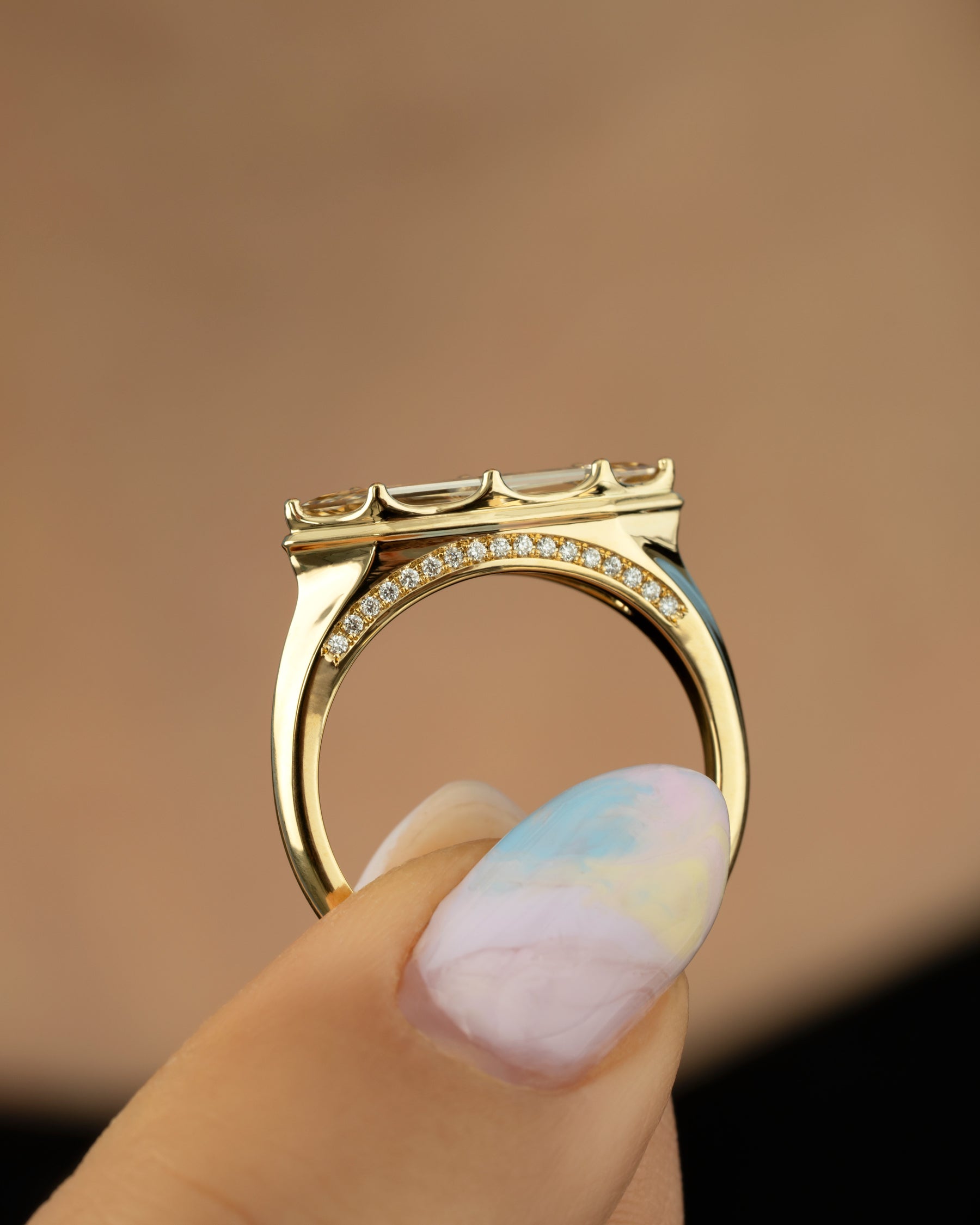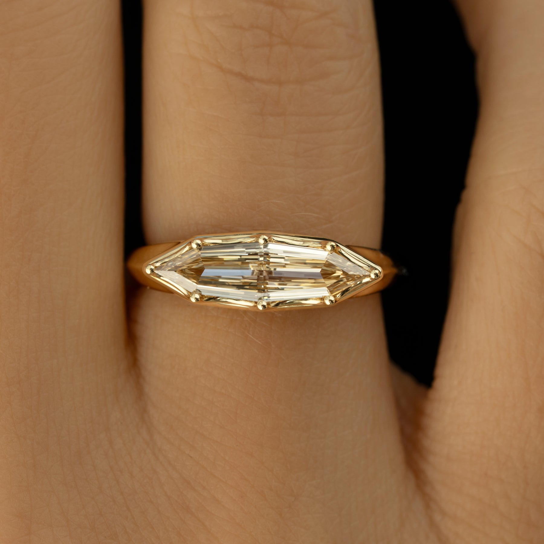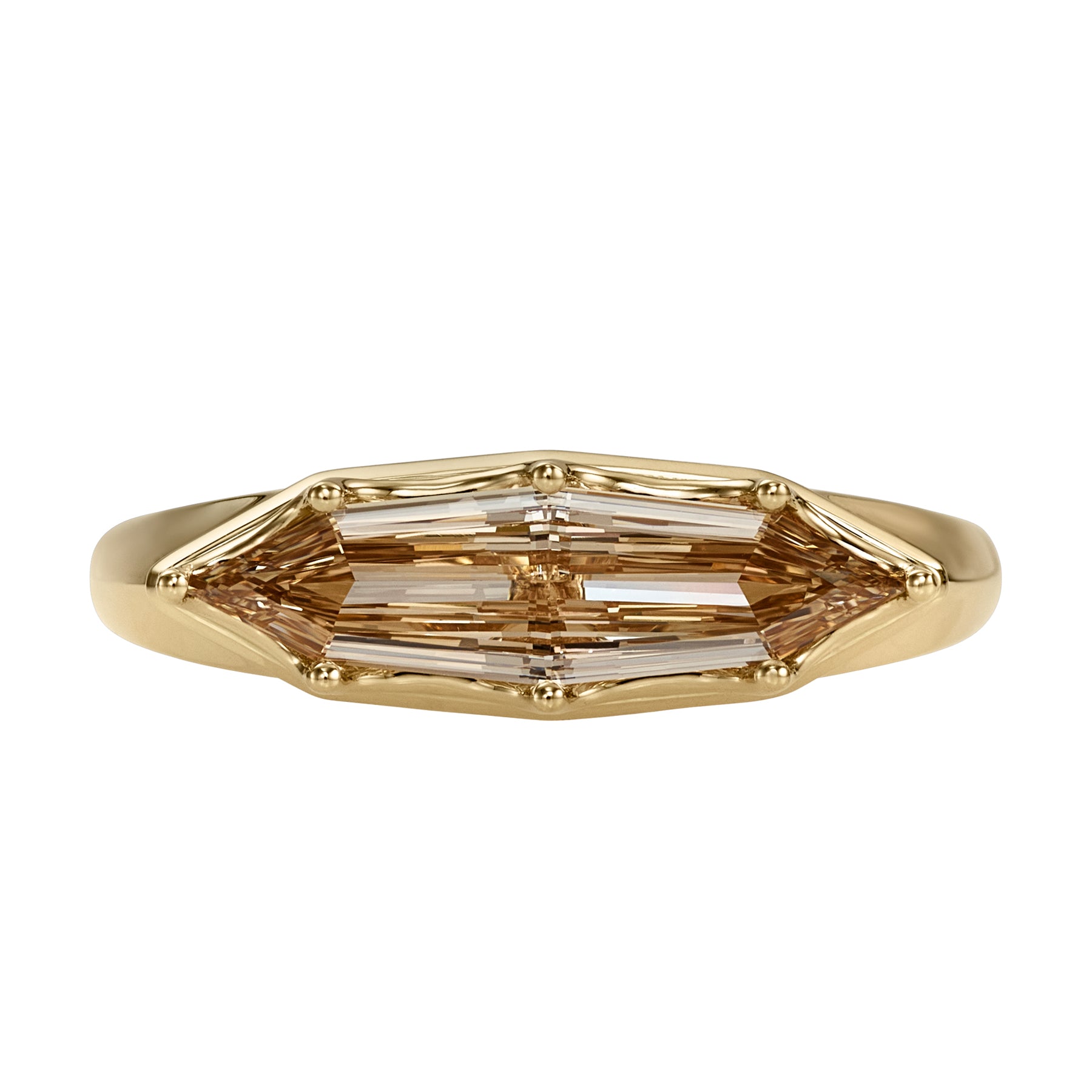 The Fancy Color Marquise Diamond Solitaire Ring with Pave Detailing is handcrafted in 18K gold. A yellow-brown modified marquise step-cut diamond takes center stage, highlighted by a subtle arch of brilliant diamonds beneath the stone. Sleek and modern, this ring offers a new take on the classic solitaire.