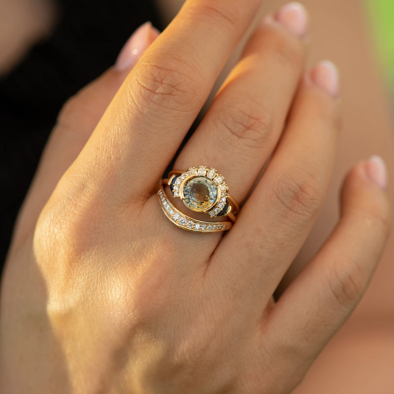 -18k solid gold | 2.83ct Parti Sapphire | Ten brilliant white diamonds | Two half-moon black diamonds