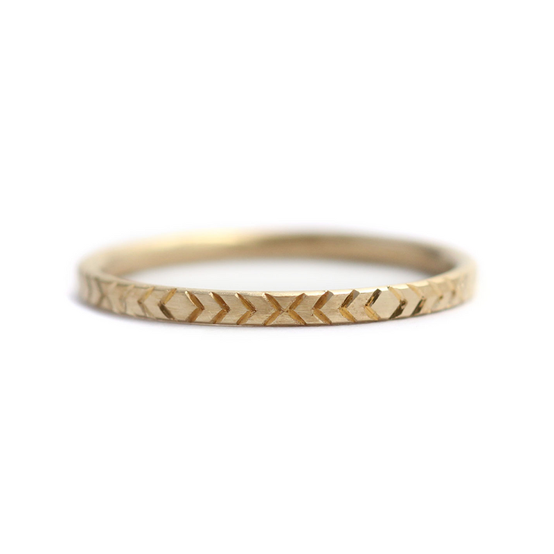 Dainty wedding ring in solid gold engraved with geometric pattern.